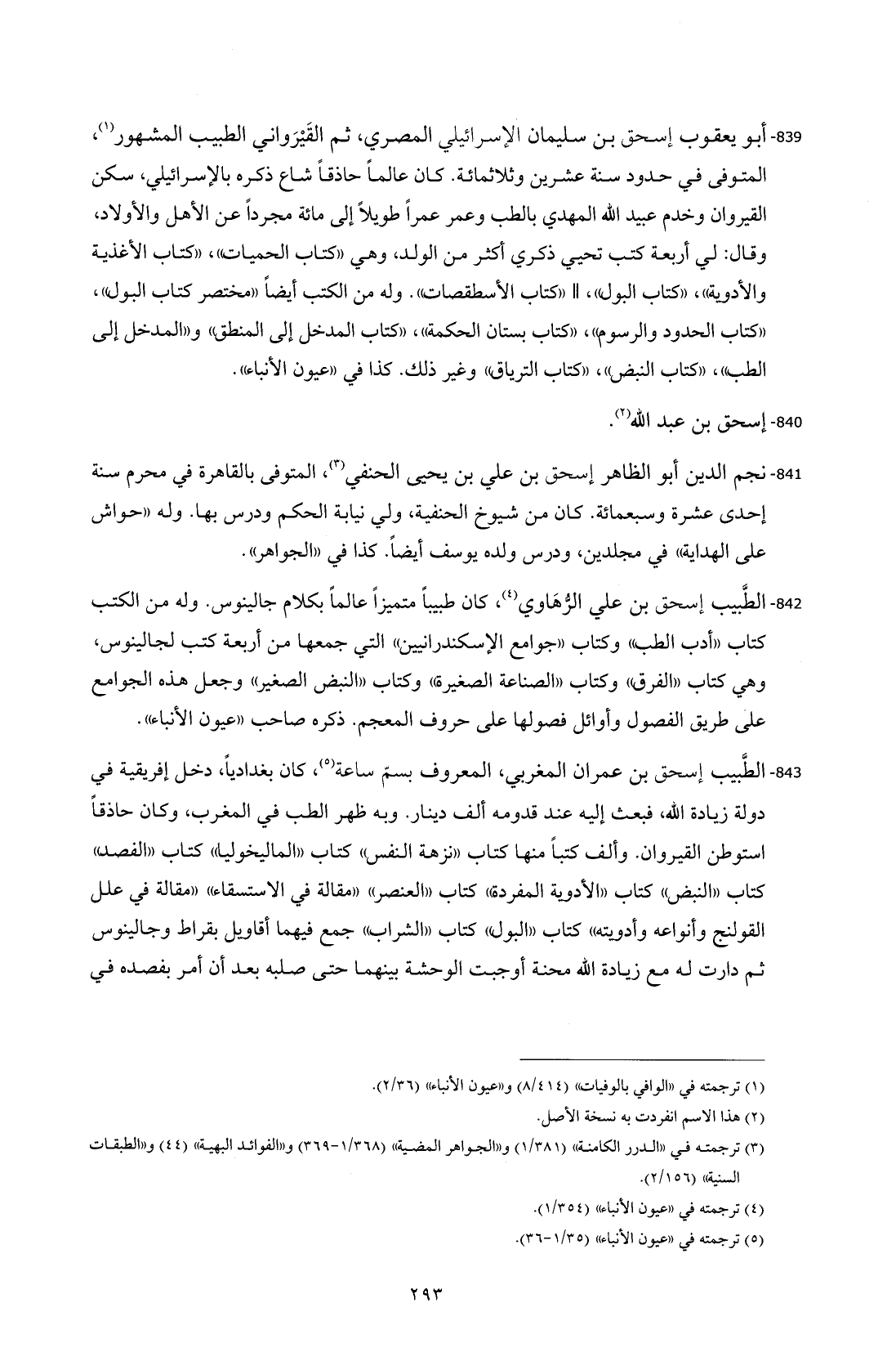 839 - أبو يعقوب إسحق بن سليمان الإسرائيلي المصري، ثم القَيْرَواني الطبيب المشهور (¬1)، المتوفى في حدود سنة عشرين وثلاثمائة. كان عالمًا حاذقًا شاع ذكره بالإسرائيلي، سكن القيروان وخدم عبيد الله المهدي بالطب وعمر عمرًا طويلًا إلى مائة مجردًا عن الأهل والأولاد، وقال: لي أربعة كتب تحيي ذكري أكثر من الولد، وهي"كتاب الحميات"، "كتاب الأغذية والأدوية"، "كتاب البول"، "كتاب الأسطقصات". وله من الكتب أيضًا "مختصر كتاب البول"، "كتاب الحدود والرسوم"، "كتاب بستان الحكمة"، "كتاب المدخل إلى المنطق" و"المدخل إلى الطب"، "كتاب النبض"، "كتاب الترياق" وغير ذلك. كذا في "عيون الأنباء".