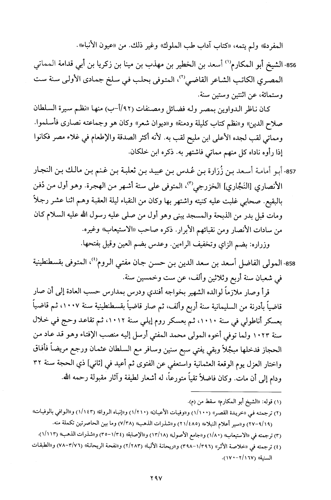 856 - الشيخ أبو المكارم (¬1) أسعد بن الخطير بن مهذب بن مين ابن زكريا بن أبي قدامة المماتي المصري الكاتب الشاعر القاضي (¬2)، المتوفى بحلب في سلخ جمادى الأولى سنة ست وستمائة، عن اثنتين وستين سنة.
