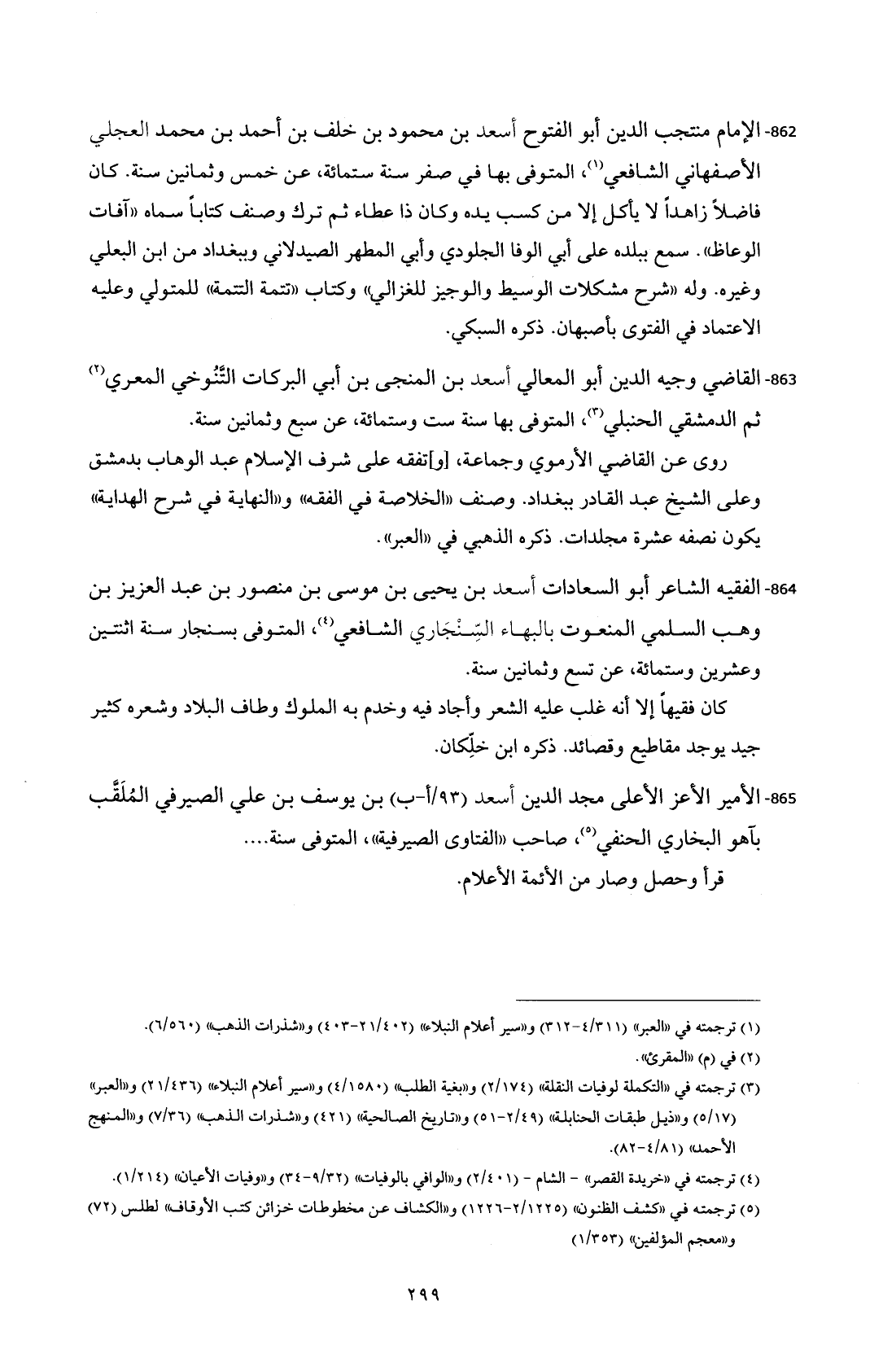 862 - الإمام منتجب الدين أبو الفتوح أسعد بن محمود بن خلف بن أحمد بن محمد العجلي الأصفهاني الشافعي (¬1)، المتوفى بها في صفر سنة ستمائة، عن خمس وثمانين سنة. كان فاضلًا زاهدًا لا يأكل إلا من كسب يده وكان ذا عطاء ثم ترك وصنَّف كتابًا سماه "آفات الوعاظ". سمع ببلده على أبي الوفا الجلودي وأبي المطهر الصيدلاني وببغداد من ابن البعلي وغيره. وله "شرح مشكلات الوسيط والوجيز للغزالي" وكتاب "تتمة التتمة" للمتولي وعليه الاعتماد في الفتوى بأصبهان. ذكره السبكي.
