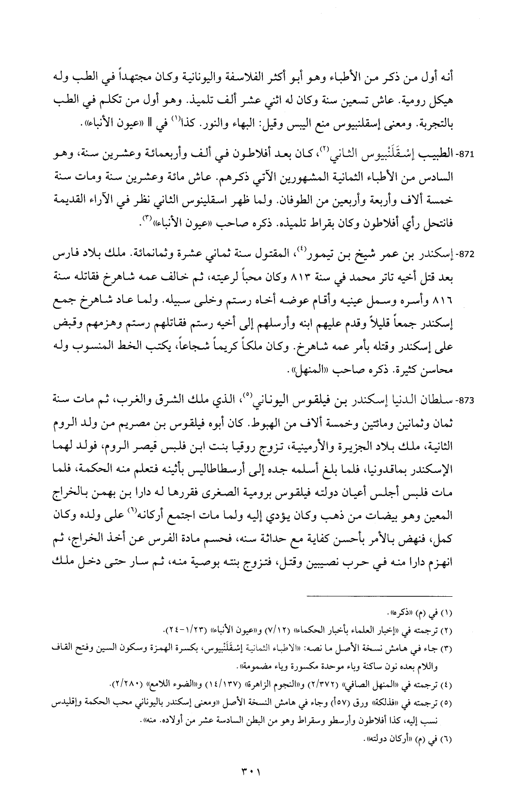 871 - الطبيب إسْقَلَنْبيوس الثاني (¬2)، كان بعد أفلاطون في ألف وأربعمائة وعشرين سنة، وهو السادس من الأطباء الثمانية المشهورين الآتي ذكرهم. عاش مائة وعشرين سنة ومات سنة خمسة ألاف وأربعة وأربعين من الطوفان. ولما ظهر اسقلينوس الثاني نظر في الآراء القديمة فانتحل رأي أفلاطون وكان بقراط تلميذه. ذكره صاحب "عيون الأنباء" (¬3).