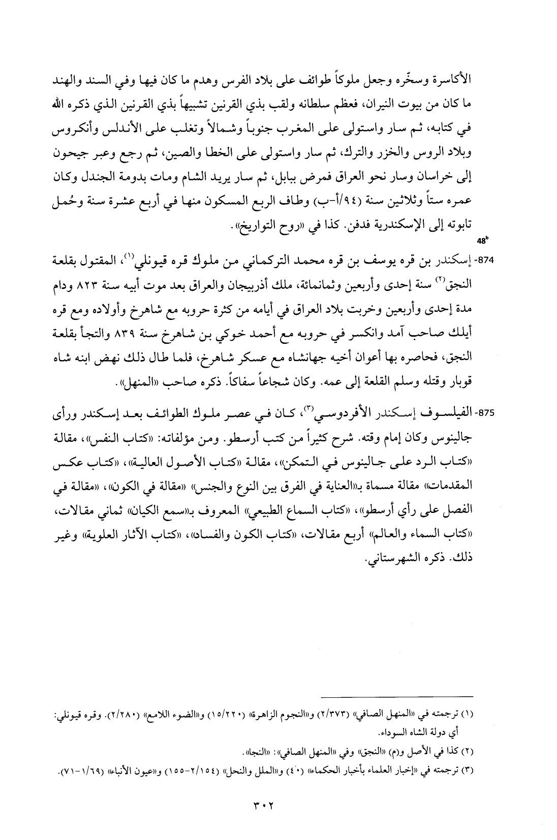 875 - الفيلسوف إسكندر الأفردوسي (¬3)، كان في عصر ملوك الطوائف بعد إسكندر ورأى جالينوس وكان إمام وقته. شرح كثيرًا من كتب أرسطو. ومن مؤلفاته: "كتاب النفس"، مقالة "كتاب الرد على جالينوس في التمكن"، مقالة "كتاب الأصول العالية"، "كتاب عكس المقدمات" مقالة مسماة بـ"العناية في الفرق بين النوع والجنس" "مقالة في الكون"، "مقالة في الفصل على رأي أرسطو"، "كتاب السماع الطبيعي" المعروف بـ"سمع الكيان" ثماني مقالات، "كتاب السماء والعالم" أربع مقالات، "كتاب الكون والفساد"، "كتاب الآثار العلوية" وغير ذلك. ذكره الشهرستاني.