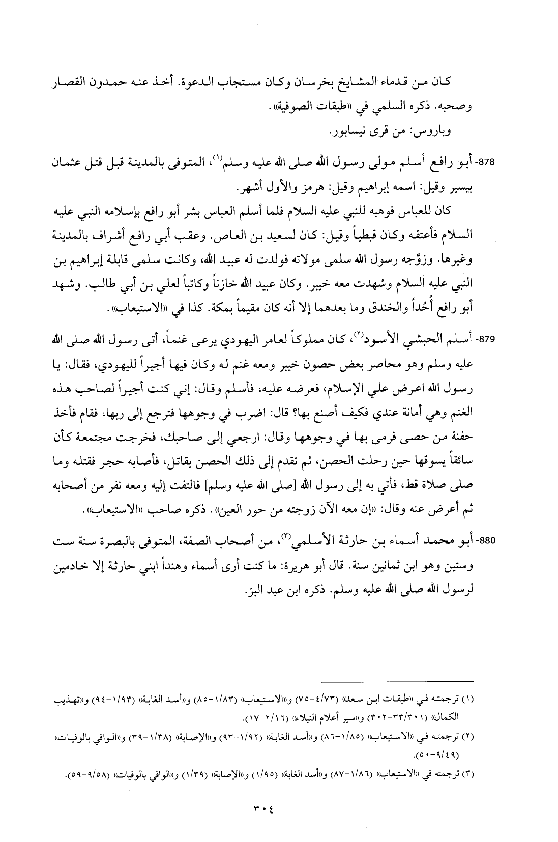 878 - أبو رافع أسلم مولى رسول الله - صلى الله عليه وسلم - (¬1)، المتوفى بالمدينة قبل قتل عثمان بيسير وقيل: اسمه إبراهيم وقيل: هرمز والأول أشهر.