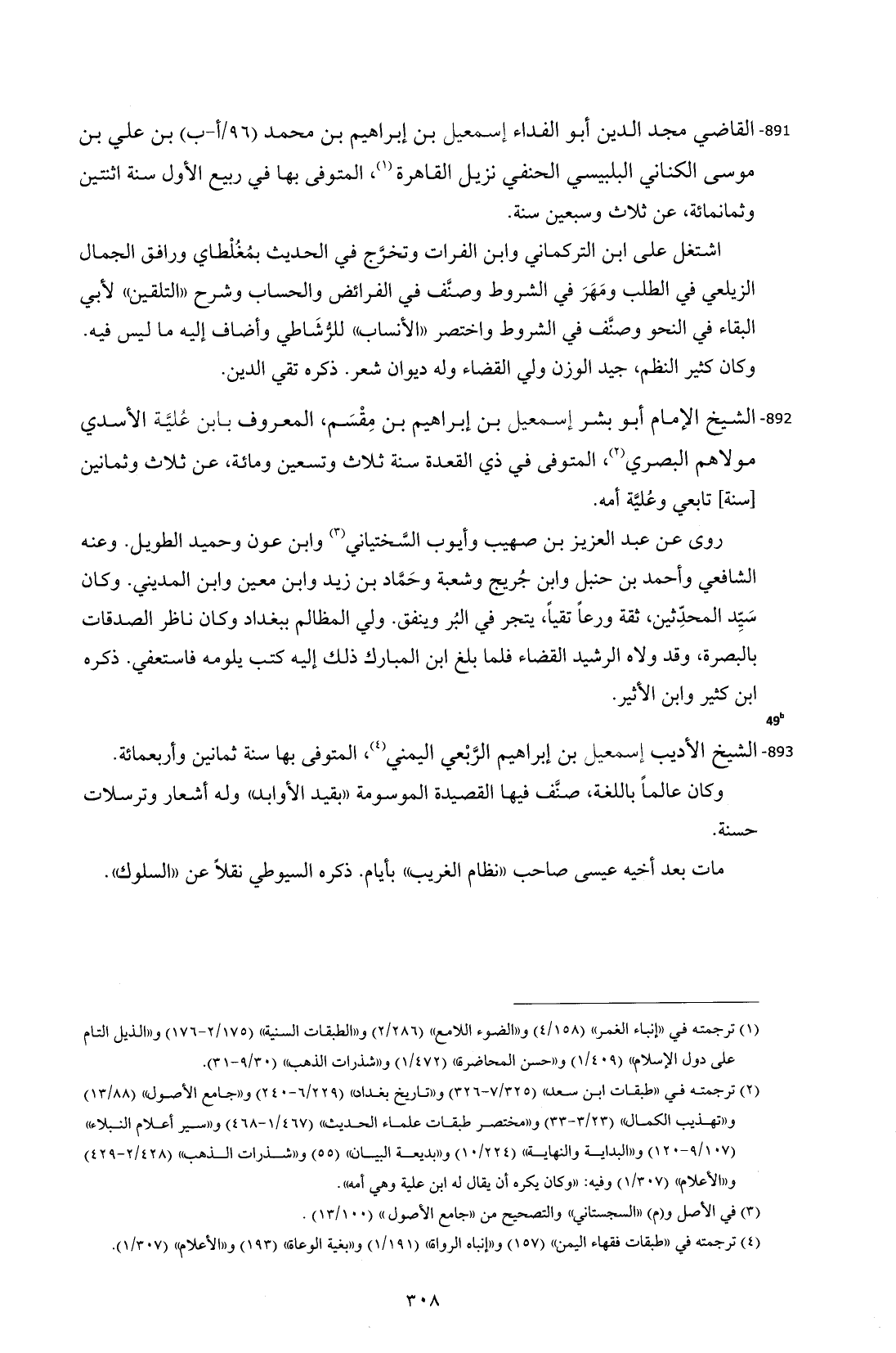 891 - القاضي مسجد الدين أبو الفداء إسمعيل بن إبراهيم بن محمد (96 / أ- ب) بن علي بن موسى الكناني البلبيسي الحنفي نزيل القاهرة (¬1)، المتوفى بها في ربيع الأول سنة اثنتين وثمانمائة، عن ثلاث وسبعين سنة.