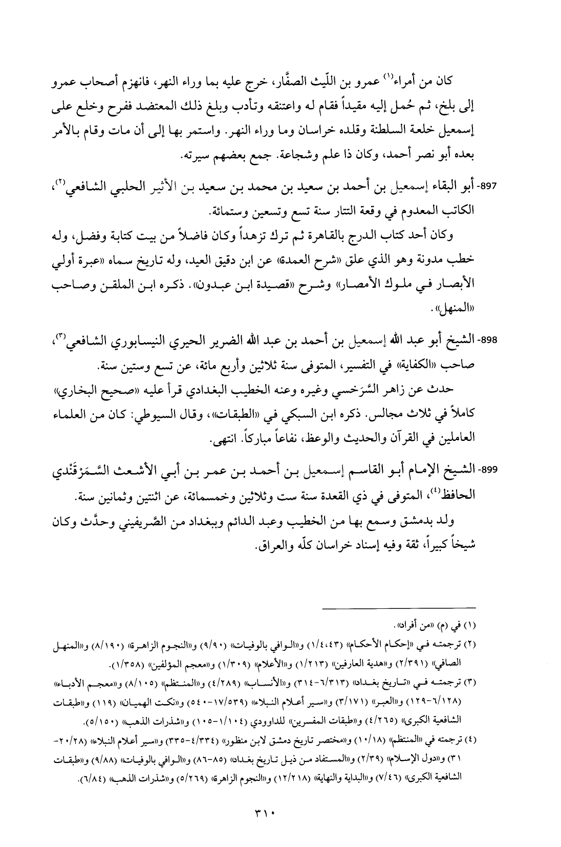 898 - الشيخ أبو عبد الله إسمعيل بن أحمد بن عبد الله الضرير الحيري النيسابوري الشافعي (¬3)، صاحب "الكفاية" في التفسير، المتوفى سنة ثلاثين وأربع مائة، عن تسع وستين سنة.