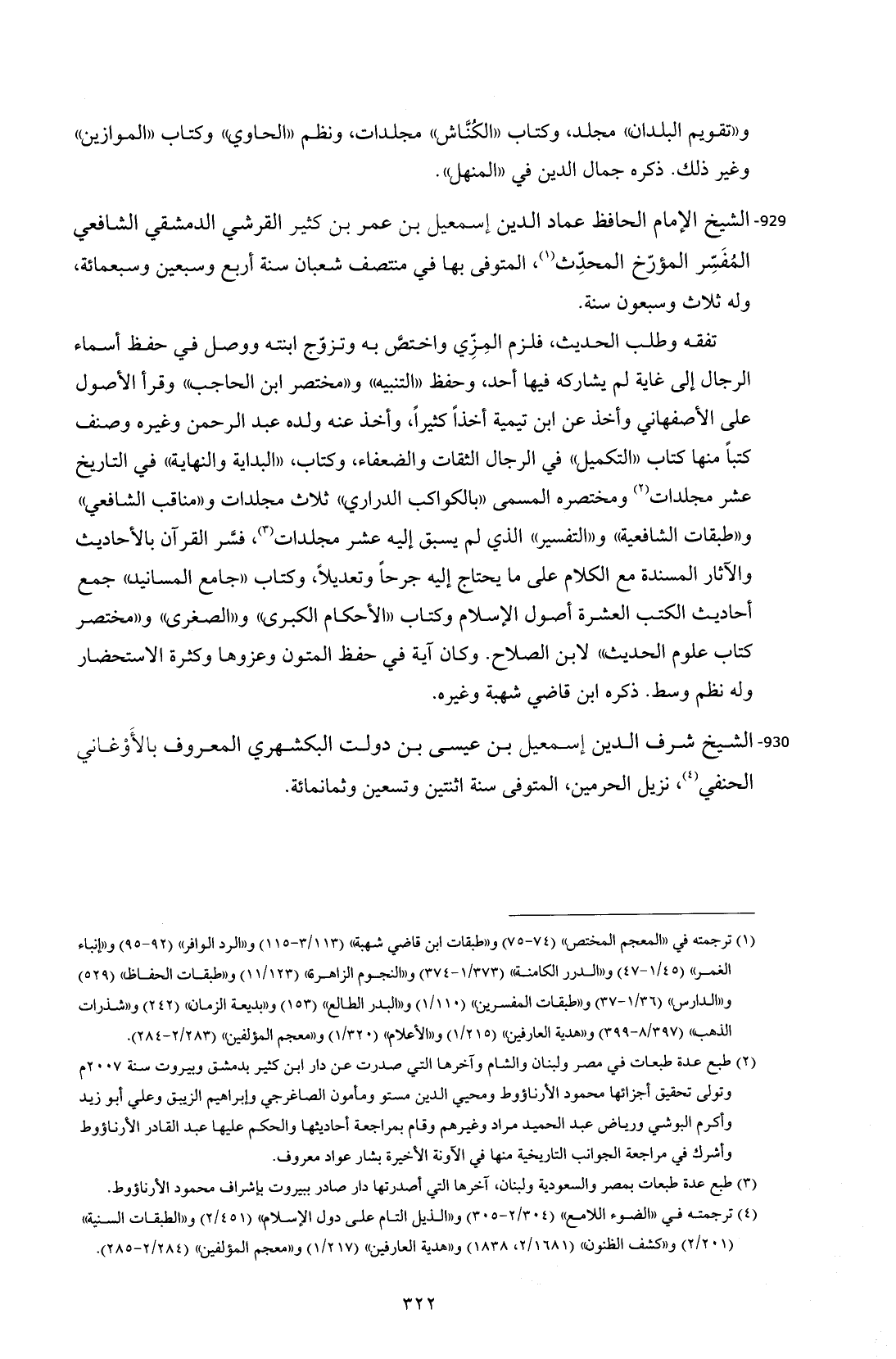 929 - الشيخ الإمام الحافظ عماد الدين إسمعيل بن عمر بن كثير القرشي الدمشقي الشافعي المُفَسِّر المؤرِّخ المحدِّث (¬1)، المتوفى بها في منتصف شعبان سنة أربع وسبعين وسبعمائة، وله ثلاث وسبعون سنة.