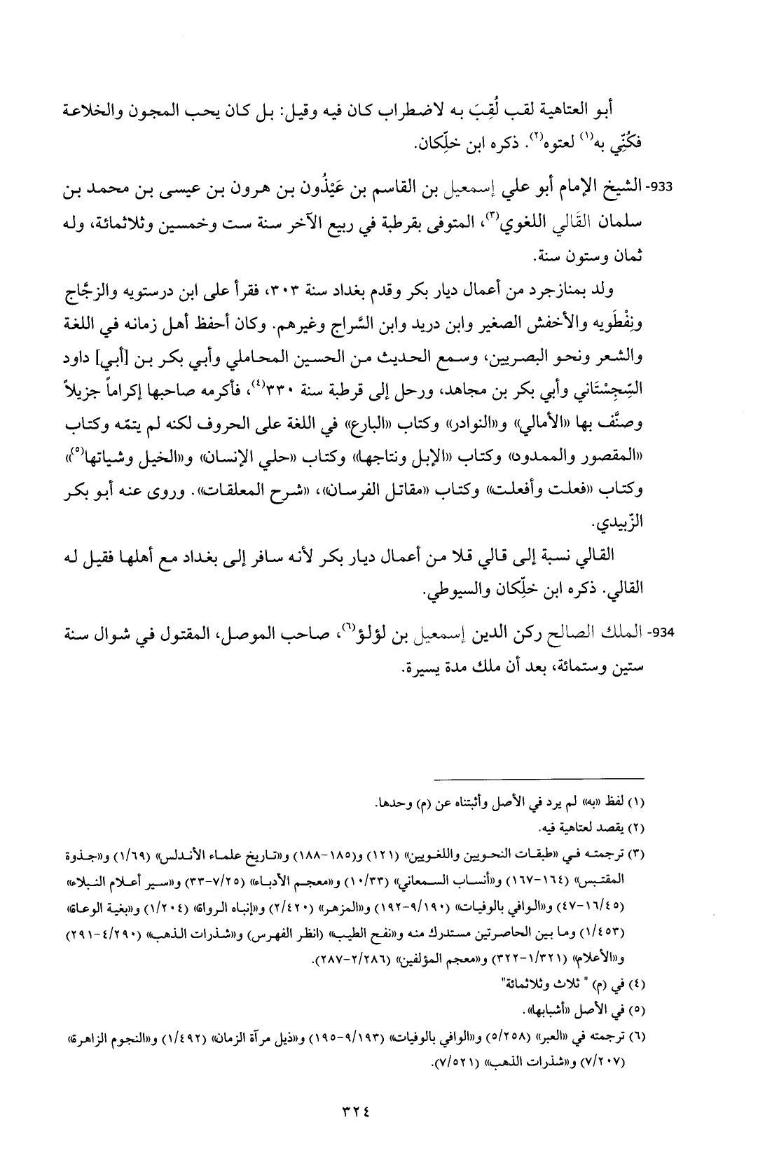 933 - الشيخ الإمام أبو علي إسمعيل بن القاسم بن عَيْذُون بن هرون بن عيسى بن محمد بن سلمان القَالي اللغوي (¬3)، المتوفى بقرطبة في ربيع الآخر سنة ست وخمسين وثلاثمائة، وله ثمان وستون سنة.