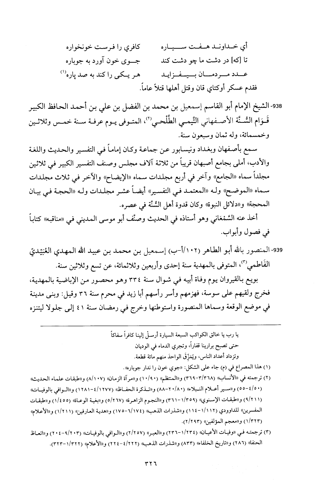 938 - الشيخ الإمام أبو القاسم إسمعيل بن محمد بن الفضل بن علي بن أحمد الحافظ الكبير قَوَام السُّنَّة الأصفهاني التَّيمي الطَّلْحي (¬2)، المتوفى يوم عرفة سنة خمس وثلاثين وخمسمائة، وله ثمان وسبعون سنة.