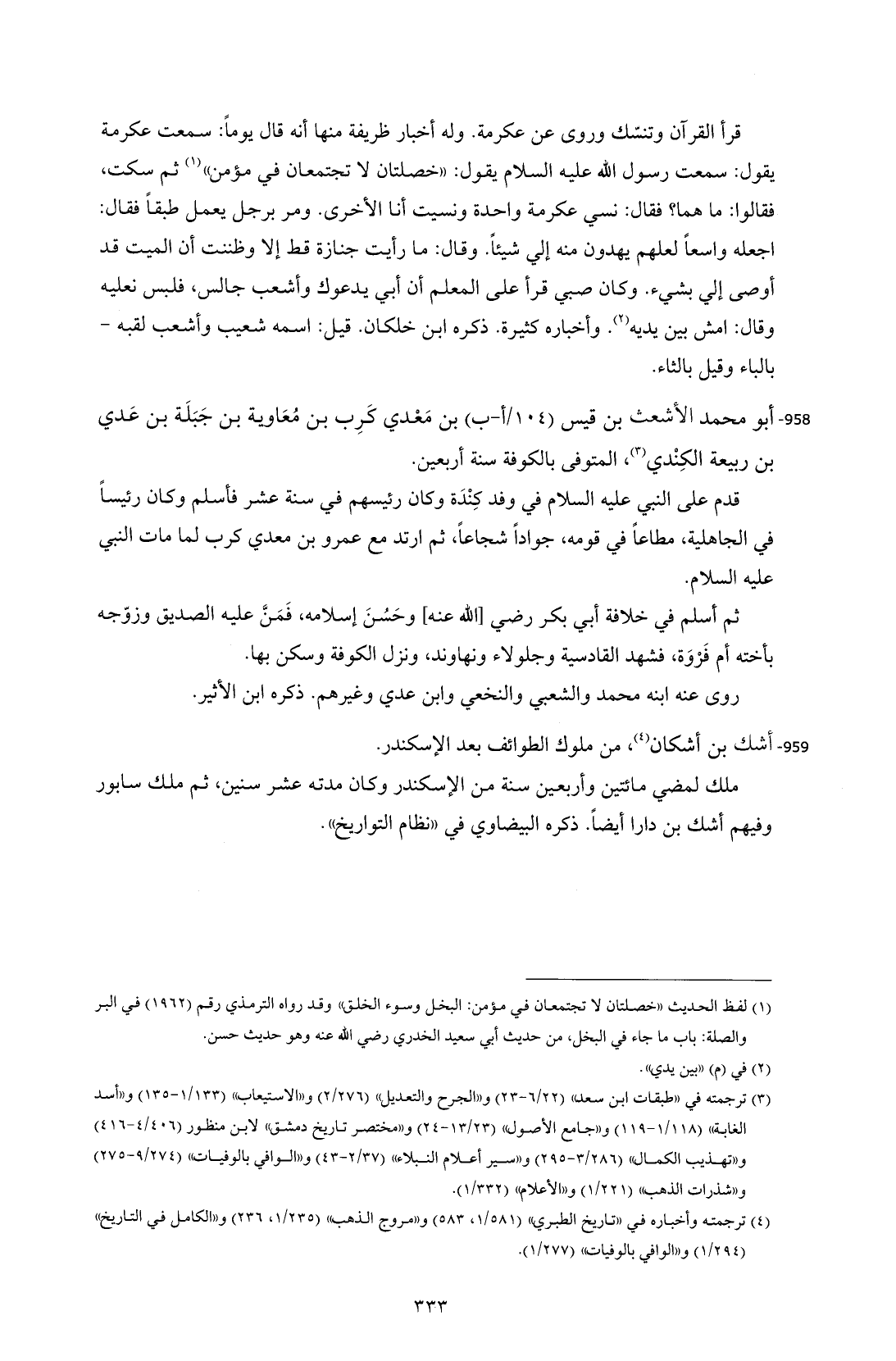 958 - أبو محمد الأشعث بن قيس (104/ أ- ب) بن مَعْدي كَرِب بن مُعَاوية بن جَبَلَة بن عَدي بن ربيعة الكِنْدي (¬3)، المتوفى بالكوفة سنة أربعين.