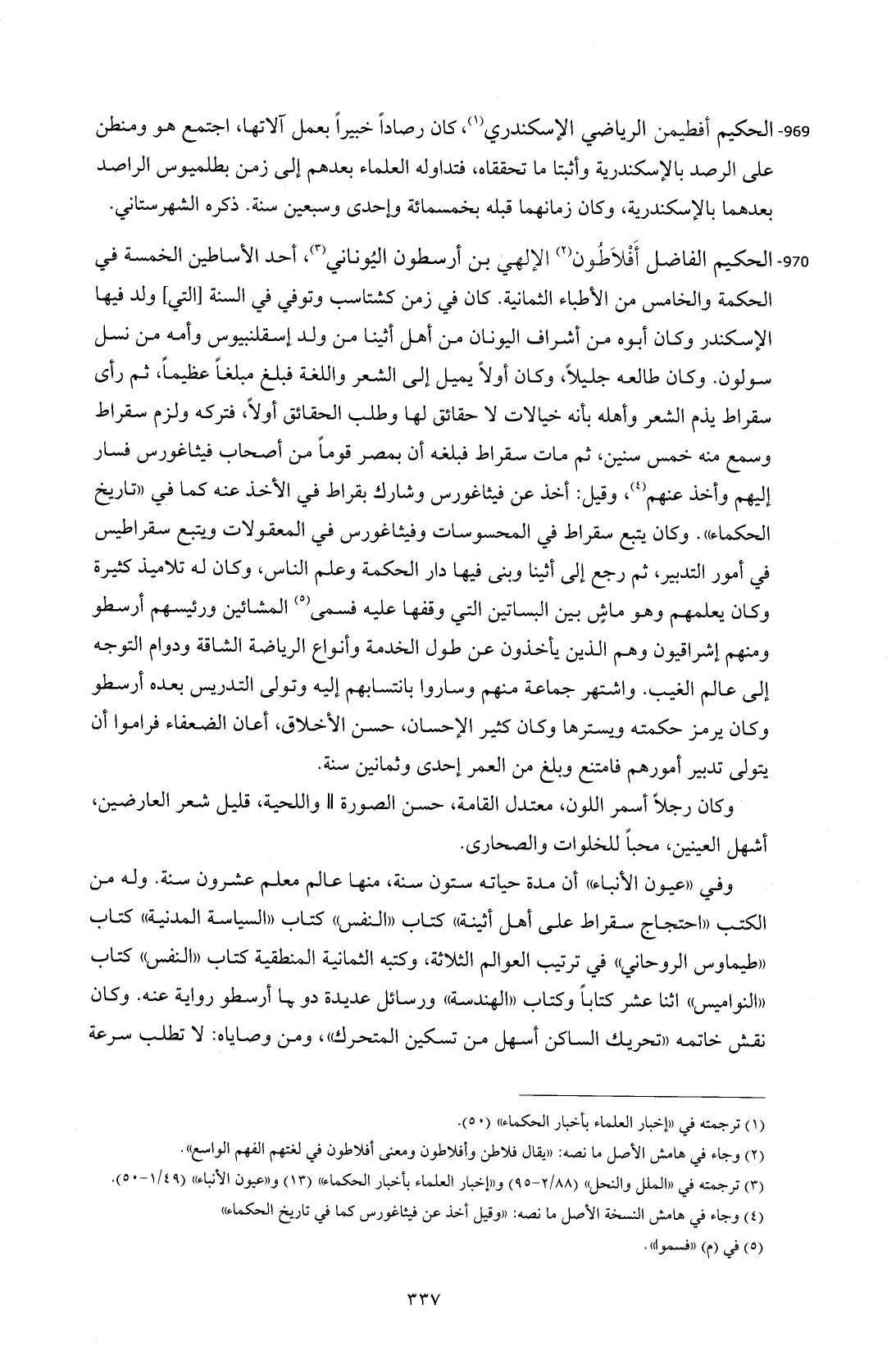 (¬4) وجاء في هامش النسخة الأصل ما نصه: "وقيل أخذ عن فيثاغورس كما في تاريخ الحكماء"