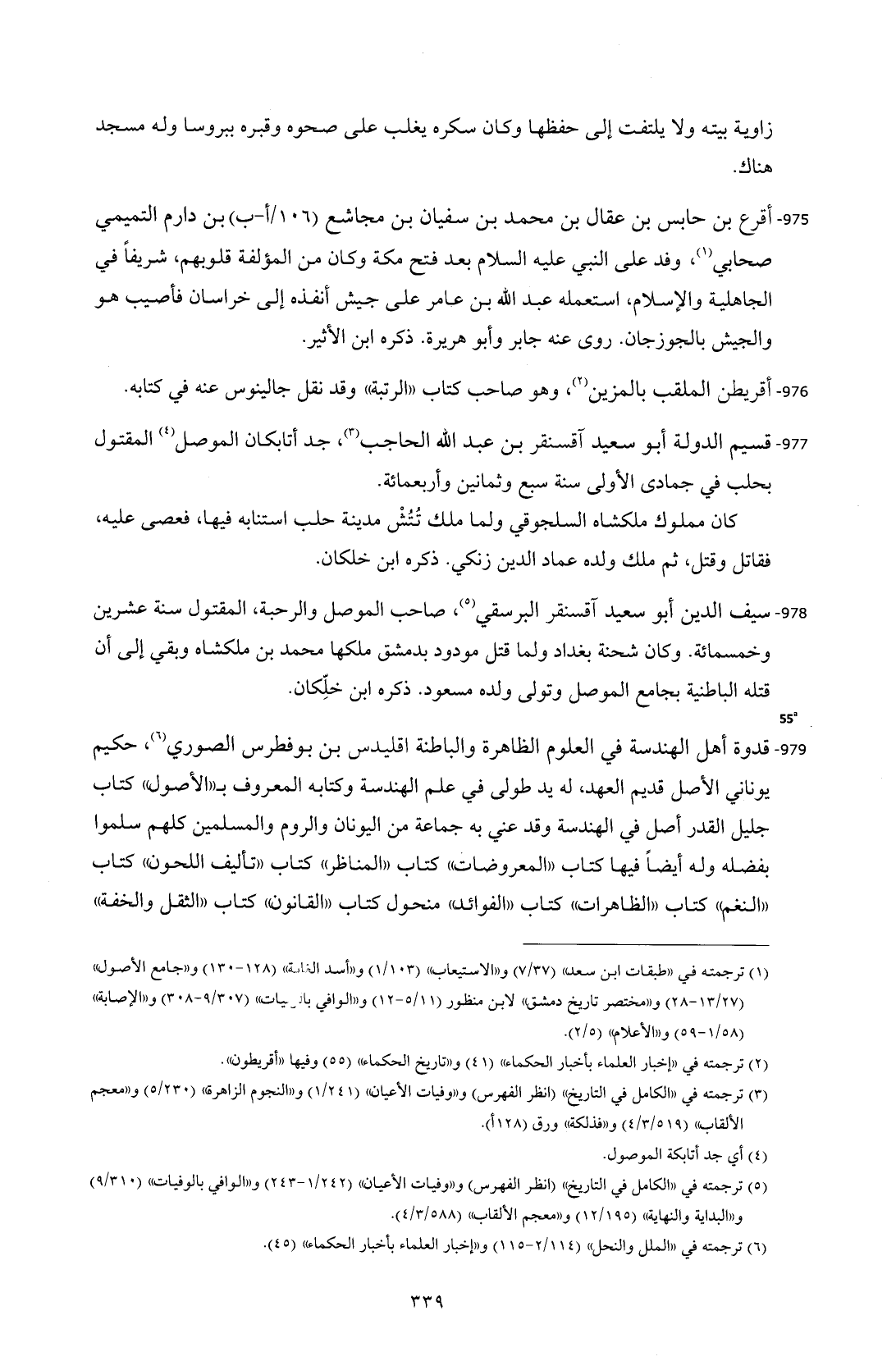979 - قدوة أهل الهندسة في العلوم الظاهرة والباطنة اقليدس بن بوفطرس الصوري (¬6)، حكيم يوناني الأصل قديم العهد، له يد طولى في علم الهندسة وكتابه المعروف بـ"الأصول" كتاب جليل القدر أصل في الهندسة وقد عني به جماعة من اليونان والروم والمسلمين كلهم سلموا بفضله وله أيضاً فيها كتاب "المعروضات" كتاب "المناظر" كتاب "تأليف اللحون" كتاب "النغم" كتاب "الظاهرات" كتاب "الفوائد" منحول كتاب "القانون" كتاب "الثقل والخفة"