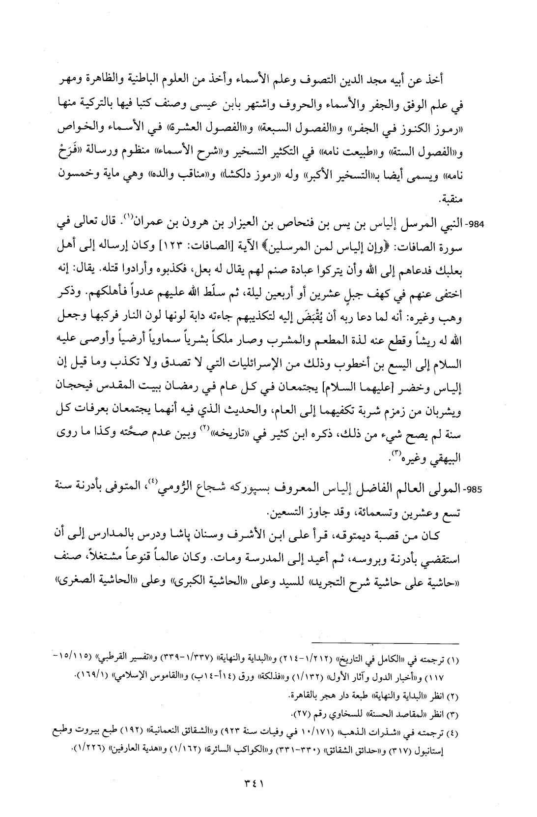 984 - النبي المرسل إلياس بن يس بن فنحاص بن العيزار بن هرون بن عمران (¬1). قال تعالى في سورة الصافات: {وَإِنَّ إِلْيَاسَ لَمِنَ الْمُرْسَلِينَ} الآية [الصافات: 123] وكان إرساله إلى أهل بعلبك فدعاهم إلى الله وأن يتركوا عبادة صنم لهم يقال له بعل، فكذبوه وأرادوا قتله. يقال: إنه اختفى عنهم في كهف جبلٍ عشرين أو أربعين ليلة، ثم سلّط الله عليهم عدواً فأهلكهم. وذكر وهب وغيره: أنه لما دعا ربه أن يُقْبَضَ إليه لتكذيبهم جاءته دابة لونها لون النار فركبها وجعل الله له ريشاً وقطع عنه لذة المطعم والمشرب وصار ملكاً بشرياً سماوياً أرضياً وأوصى عليه السلام إلى اليسع بن أخطوب وذلك من الإسرائليات التي لا تصدق ولا تكذب وما قيل إن إلياس وخضر [عليهما السلام] يجتمعان في كل عام في رمضان ببيت المقدس فيحجان ويشربان من زمزم شربة تكفيهما إلى العام، والحديث الذي فيه أنهما يجتمعان بعرفات كل سنة لم يصح شيء من ذلك، ذكره ابن كثير في "تاريخه" (¬2) وبين عدم صحَّته وكذا ما روى البيهقي وغيره (¬3).