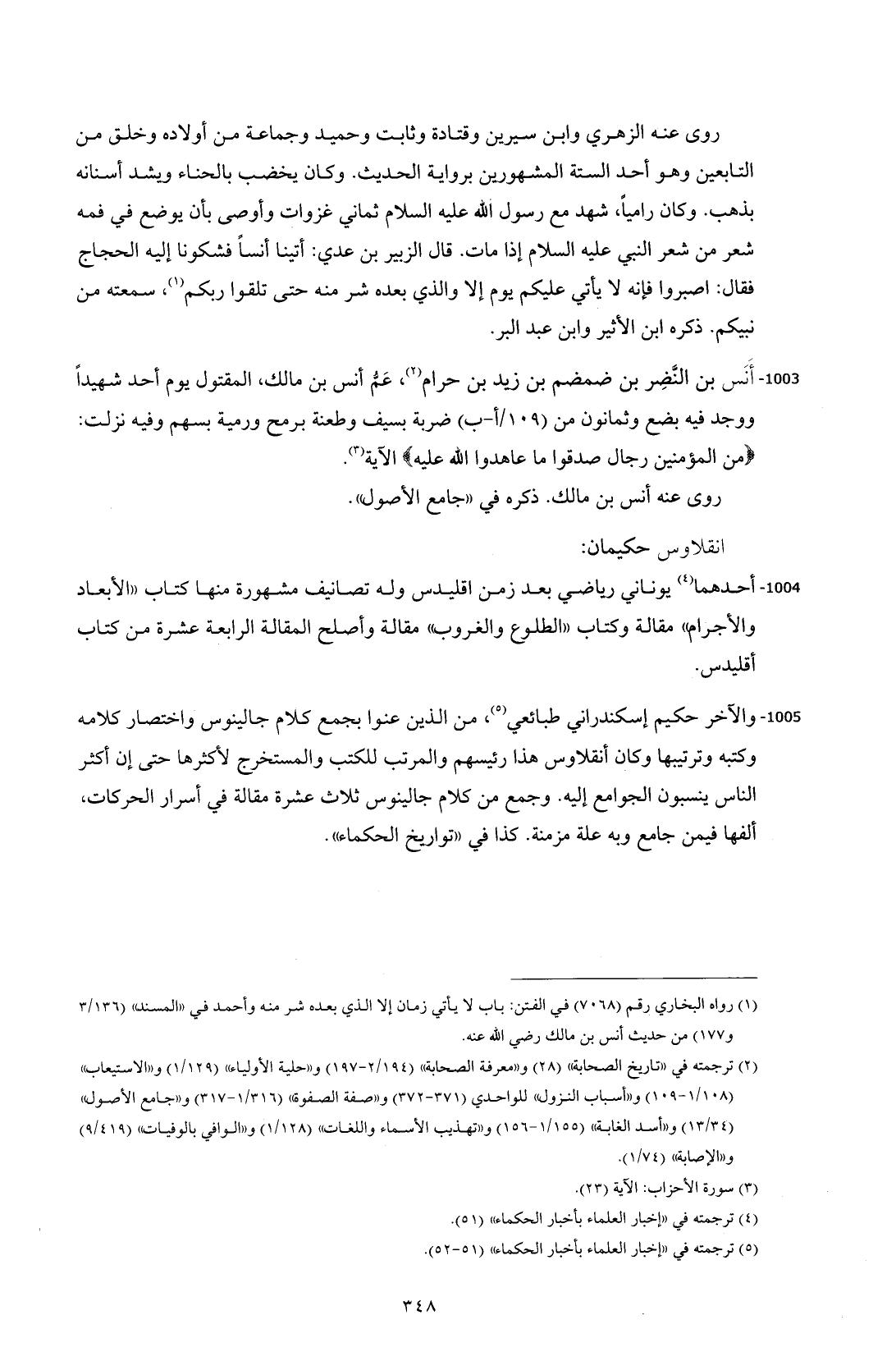 1003 - أَنس بن النَّضِر بن ضمضم بن زيد بن حرام (¬2)، عَمُّ أنس بن مالك، المقتول يوم أحد شهيداً ووجد فيه بضع وثمانون من (109/ أ - ب) ضربة بسيف وطعنة برمح ورمية بسهم وفيه نزلت: {مِنَ الْمُؤْمِنِينَ رِجَالٌ صَدَقُوا مَا عَاهَدُوا اللَّهَ عَلَيْهِ} الآية (¬3).