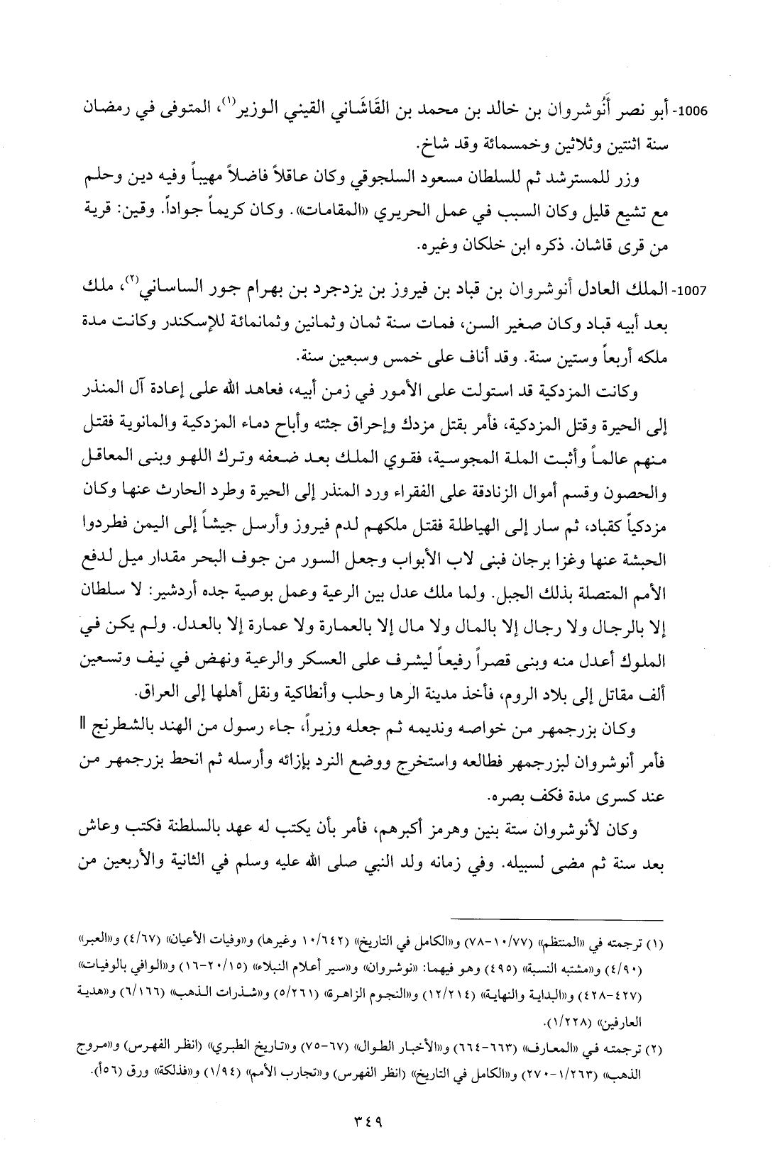 (¬1) ترجمته في "المنتظم" (10/ 77 - 78) و"الكامل في التاريخ" (10/ 642 وغيرها) و"وفيات الأعيان" (4/ 67) و"العبر" (4/ 90) و"مشتبه النسبة" (495) وهو فيهما: "نوشروان" و"سير أعلام النبلاء" (15/ 20 - 16) و"الوافي بالوفيات" (427 - 428) و"البداية والنهاية" (12/ 214) و"النجوم الزاهرة" (5/ 261) و"شذرات الذهب" (6/ 166) و"هدية العارفين" (1/ 228).