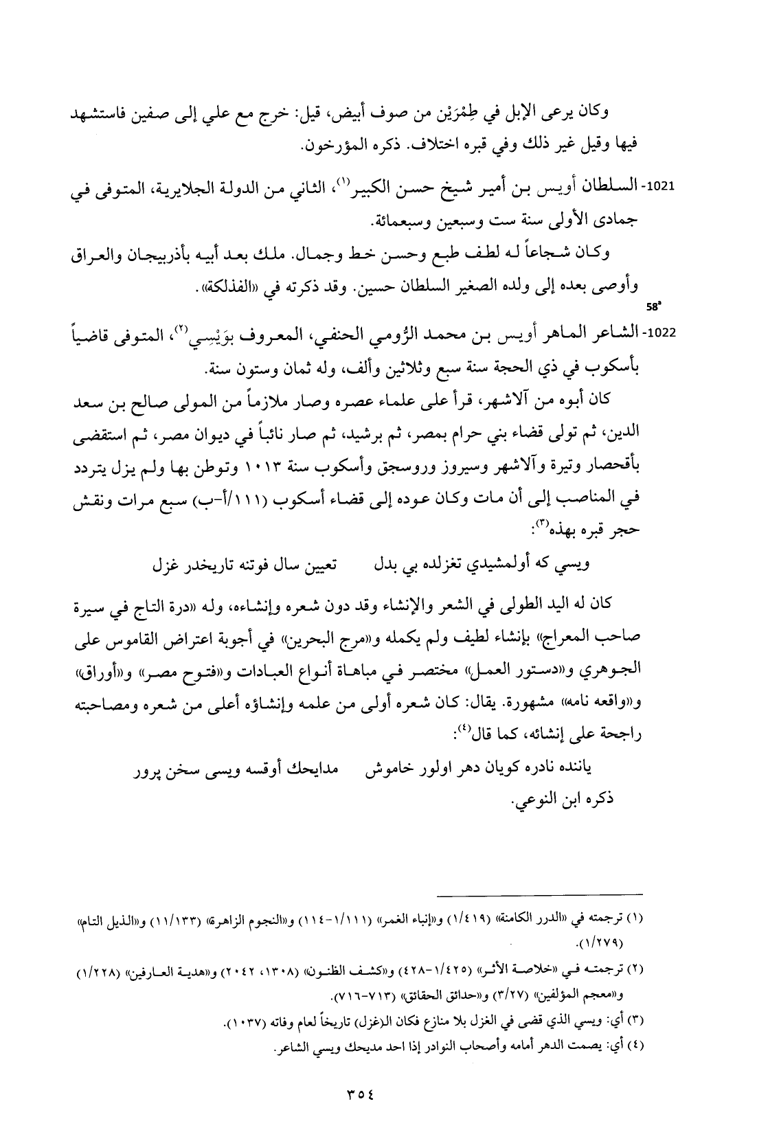1022 - الشاعر الماهر أويس بن محمد الرُّومي الحنفي، المعروف بوَيْسِي (¬2)، المتوفى قاضياً بأسكوب في ذي الحجة سنة سبع وثلاثين وألف، وله ثمان وستون سنة.