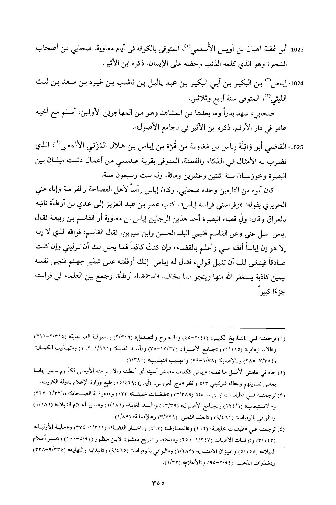 1025 - القاضي أبو وَاثِلَة إِيَاس بن مُعَاوية بن قُرَّة بن إياس بن هلال المُزَني الألمعي (¬4)، الذي تضرب به الأمثال في الذكاء والفطنة، المتوفى بقرية عبديسي من أعمال دشت ميشان بين البصرة وخوزستان سنة اثنتين وعشرين ومائة، وله ست وسبعون سنة.