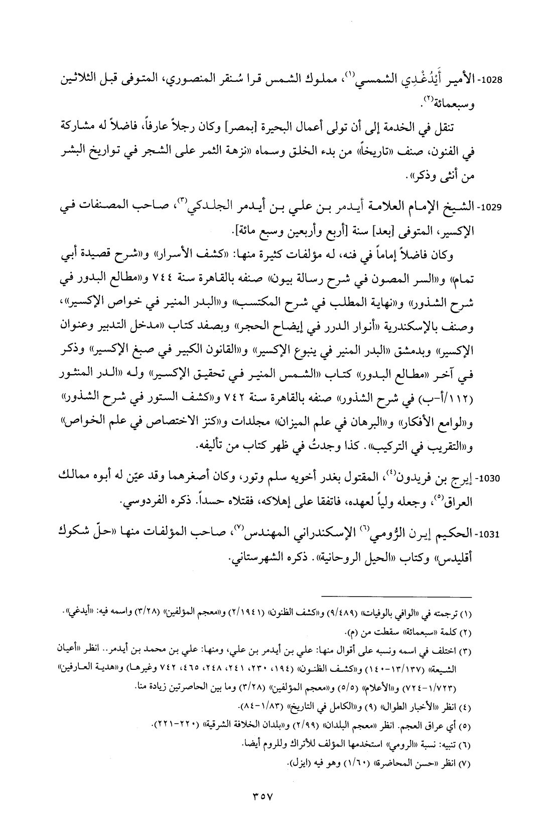 1031 - الحكيم إيرن الرُّومي (¬6) الإسكندراني المهندس (¬7)، صاحب المؤلفات منها "حلّ شكوك أقليدس" وكتاب "الحيل الروحانية". ذكره الشهرستاني.