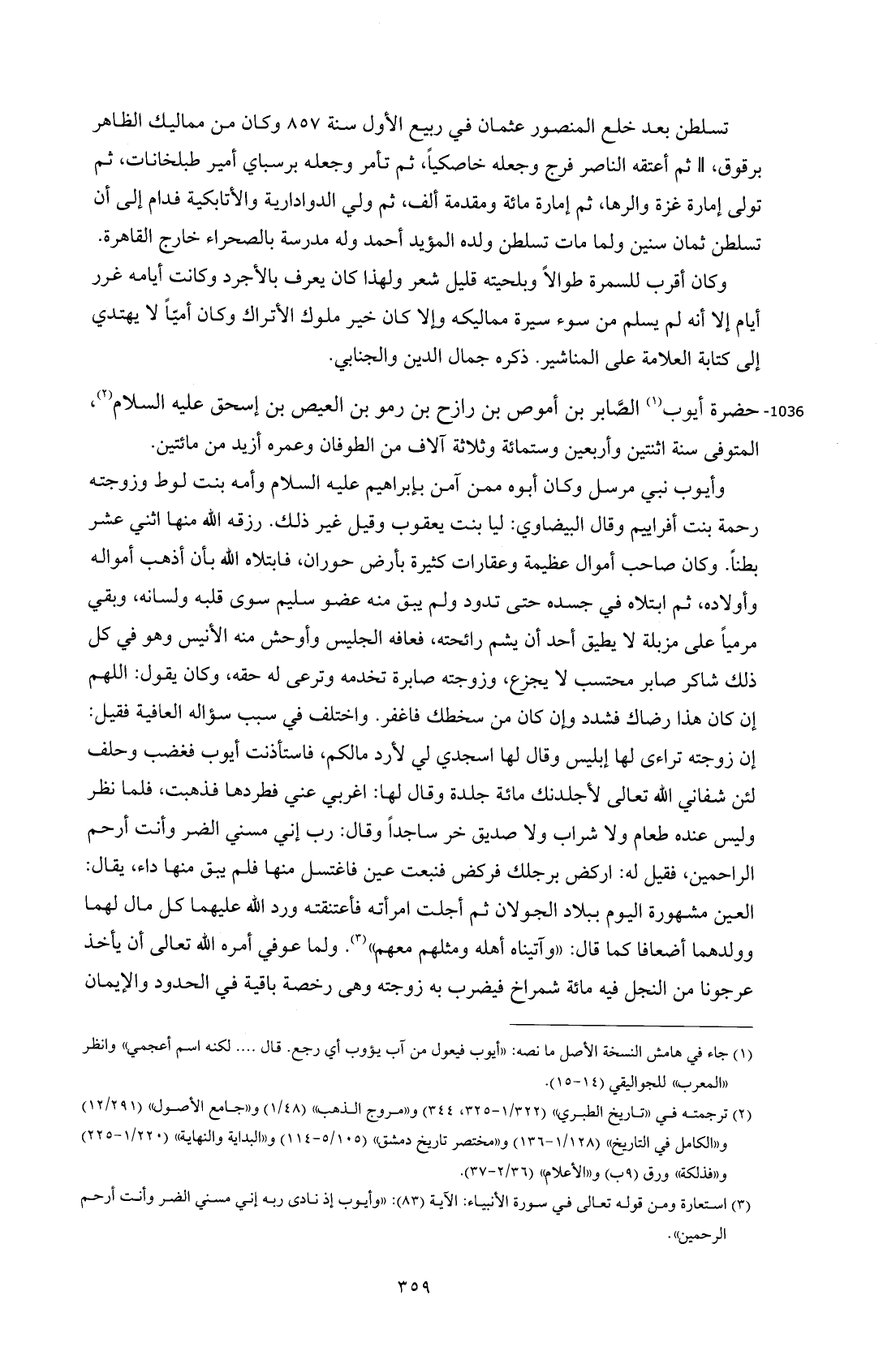 1036 - حضرة أيوب (¬1) الصَّابر بن أموص بن رازح بن رمو بن العيص بن إسحق -عليه السلام- (¬2)، المتوفى سنة اثنتين وأربعين وستمائة وثلاثة آلاف من الطوفان وعمره أزيد من مائتين.