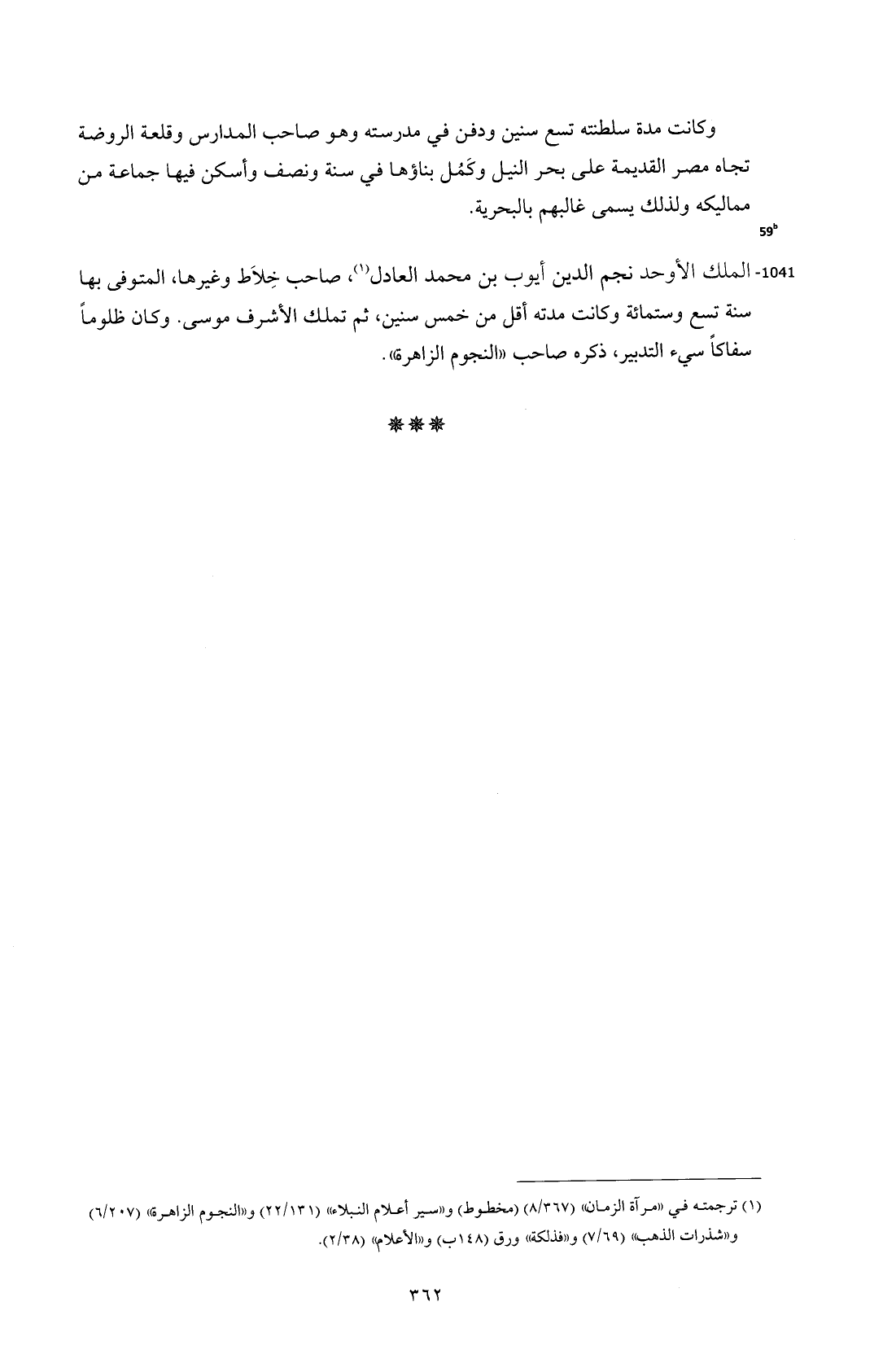 1041 - الملك الأوحد نجم الدين أيوب بن محمد العادل (¬1)، صاحب خِلاَط وغيرها، المتوفى بها سنة تسع وستمائة وكانت مدته أقل من خمس سنين، ثم تملك الأشرف موسى. وكان ظلوماً سفاكاً سيء التدبير، ذكره صاحب "النجوم الزاهرة".