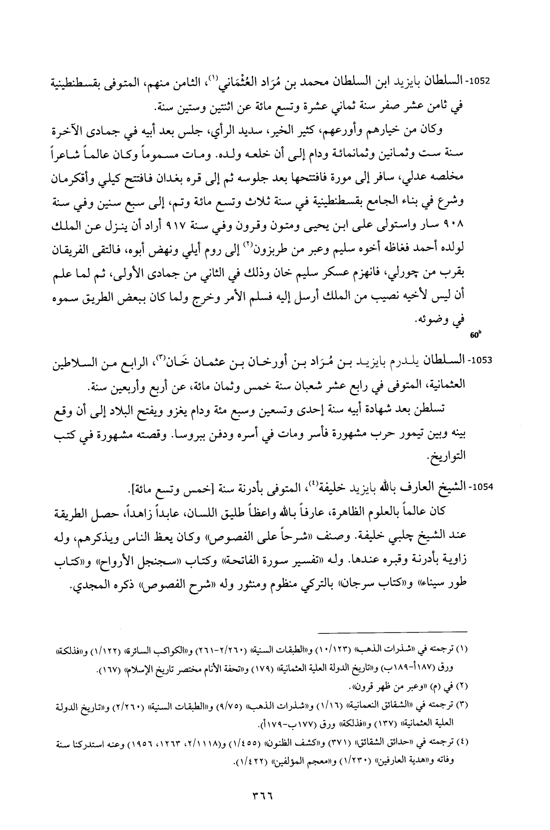 1052 - السلطان بايزيد ابن السلطان محمد بن مُرَاد العُثْمَاني (¬1)، الثامن منهم، المتوفى بقسطنطينية في ثامن عشر صفر سنة ثماني عشرة وتسع مائة عن اثنتين وستين سنة.