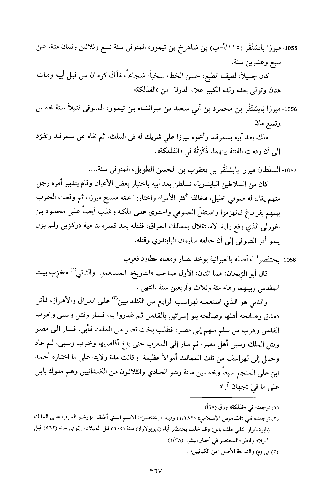 1056 - ميرزا بَايسُنْقُر بن محمود بن أبي سعيد بن ميرانشاه بن تيمور، المتوفى قتيلاً سنة خمس وتسع مائة.