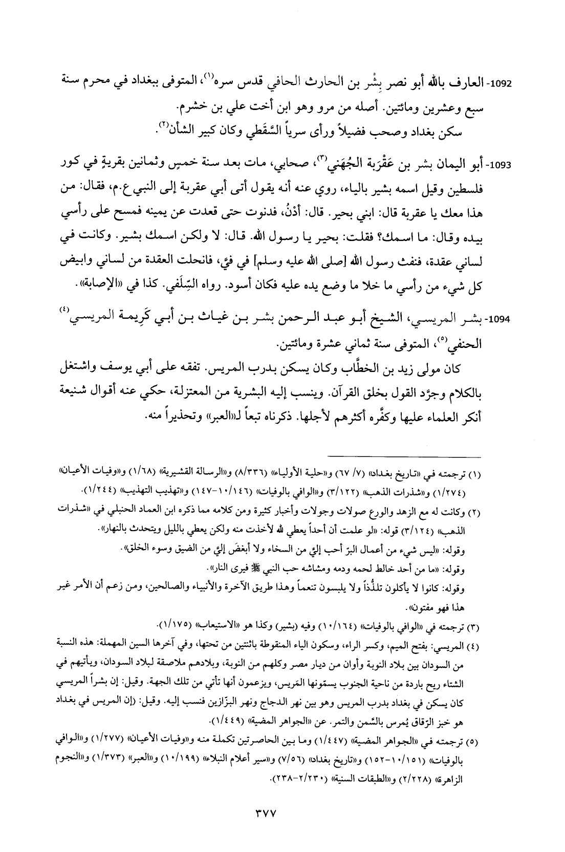 1092 - العارف بالله أبو نصر بِشْر بن الحارث الحافي قدس سره (¬1)، المتوفى ببغداد في محرم سنة سبع وعشرين ومائتين. أصله من مرو وهو ابن أخت علي بن خشرم.