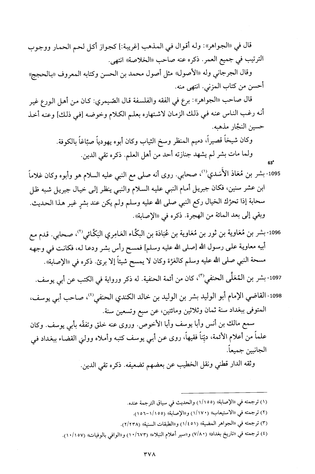 1097 - بشر بن المُعَلَّى الحنفي (¬3)، كان من أئمة الحنفية. له ذكر ورواية في الكتب عن أبي يوسف.