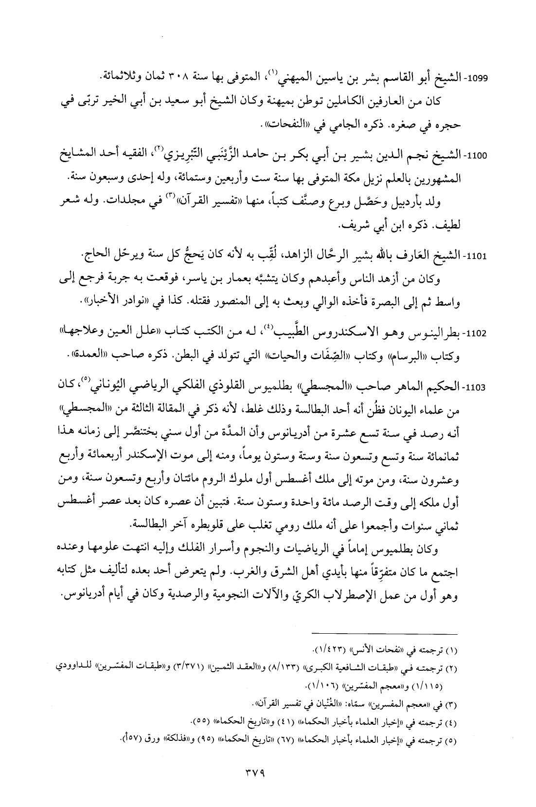 1103 - الحكيم الماهر صاحب "المجسطي" بطلميوس القلوذي الفلكي الرياضي اليُوناني (¬5)، كان من علماء اليونان فظُن أنه أحد البطالسة وذلك غلط، لأنه ذكر في المقالة الثالثة من "المجسطي" أنه رصد في سنة تسع عشرة من أدريانوس وأن المدَّة من أول سني بختنصَّر إلى زمانه هذا ثمانمائة سنة وتسع وتسعون سنة وستة وستون يوماً، ومنه إلى موت الإسكندر أربعمائة وأربع وعشرون سنة، ومن موته إلى ملك أغسطس أول ملوك الروم مائتان وأربع وتسعون سنة، ومن أول ملكه إلى وقت الرصد مائة واحدة وستون سنة. فتبين أن عصره كان بعد عصر أغسطس ثماني سنوات وأجمعوا على أنه ملك رومي تغلب على قلوبطره آخر البطالسة.