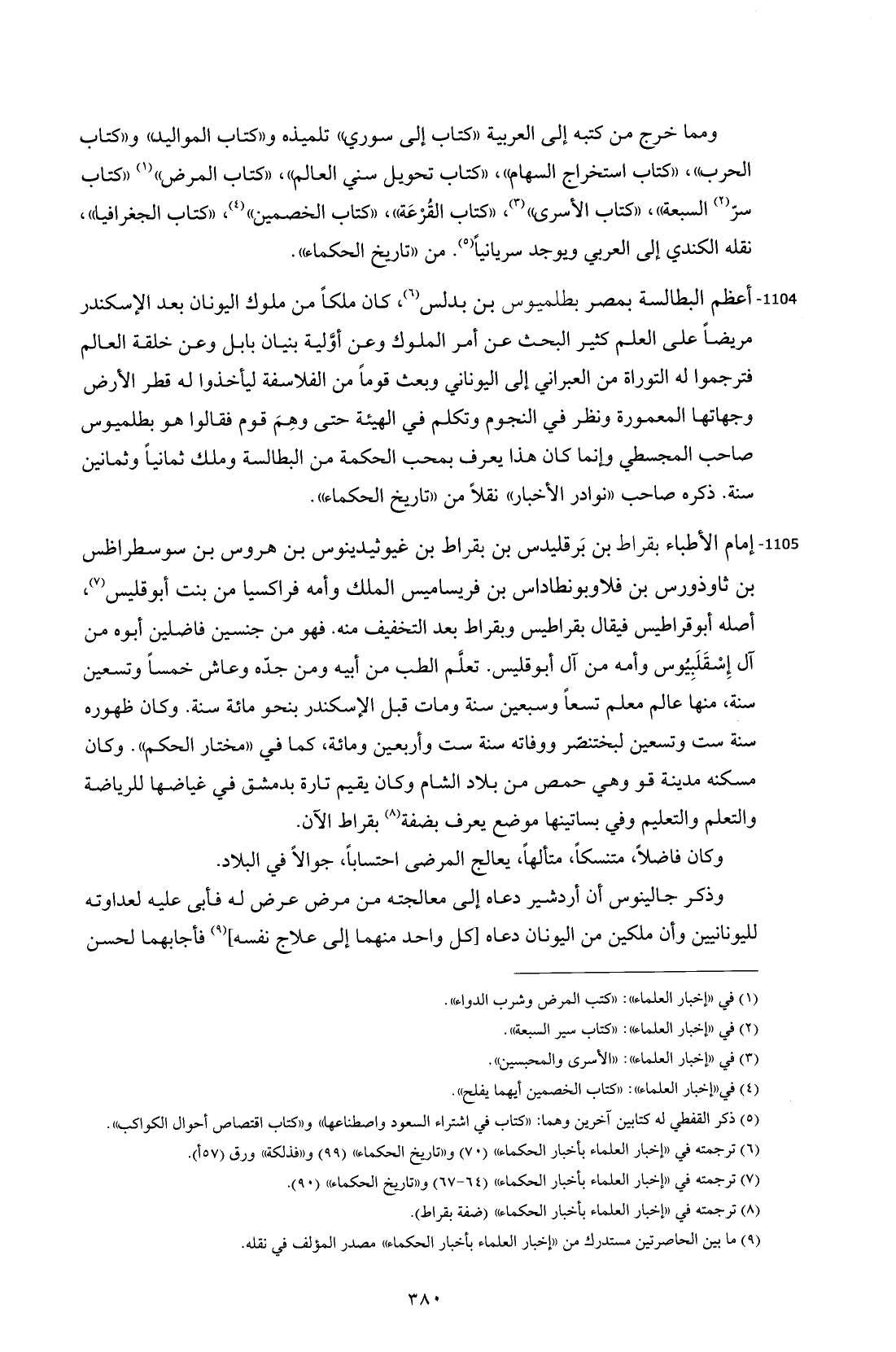 (¬8) ترجمته في "إخبار العلماء بأخبار الحكماء" (ضفة بقراط).