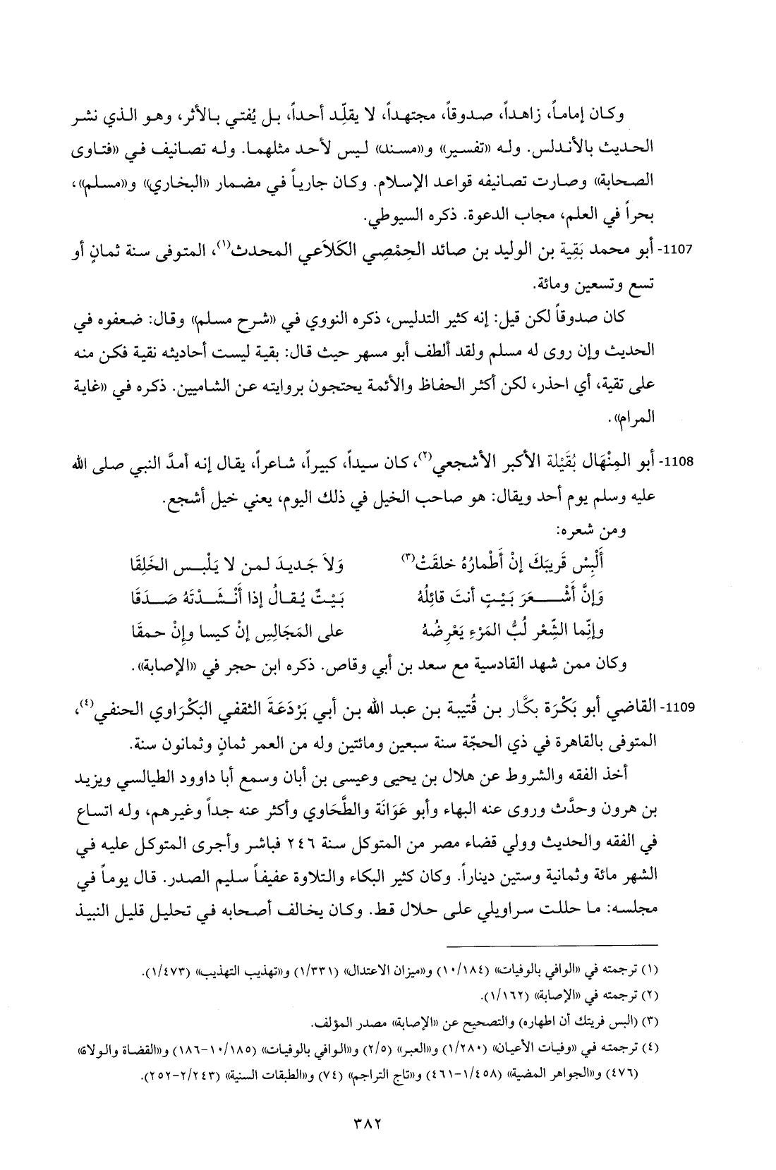 1107 - أبو محمد بَقِية بن الوليد بن صائد الحِمْصِي الكَلاَعي المحدث (¬1)، المتوفى سنة ثمانٍ أو تسع وتسعين ومائة.