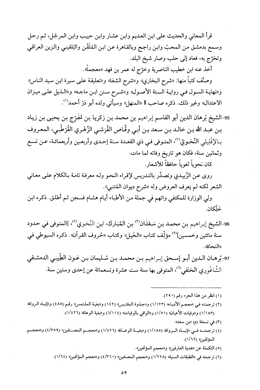 96 - الشيخ إبراهيم بن محمد بن سَعْدَان (¬3) بن المُبَارك، ابن النَّحَوي (¬4)، [المتوفى في حدود سنة مائتين وخمسين] (¬5) مؤلِّف كتاب "الخَيل" وكتاب "حُروف القرآن". ذكره السيوطي في "النحاة".