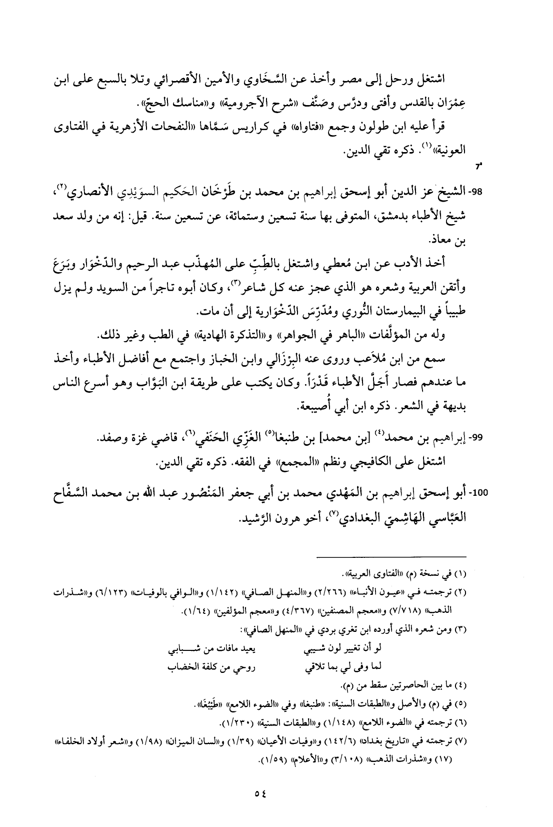 100 - أبو إسحق إبراهيم بن المَهْدي محمد بن أبي جعفر المَنْصُور عبد الله بن محمد السَّفَّاح العَبَّاسي الهَاشِميّ البغدادي (¬7)، أخو هارون الرَّشيد.