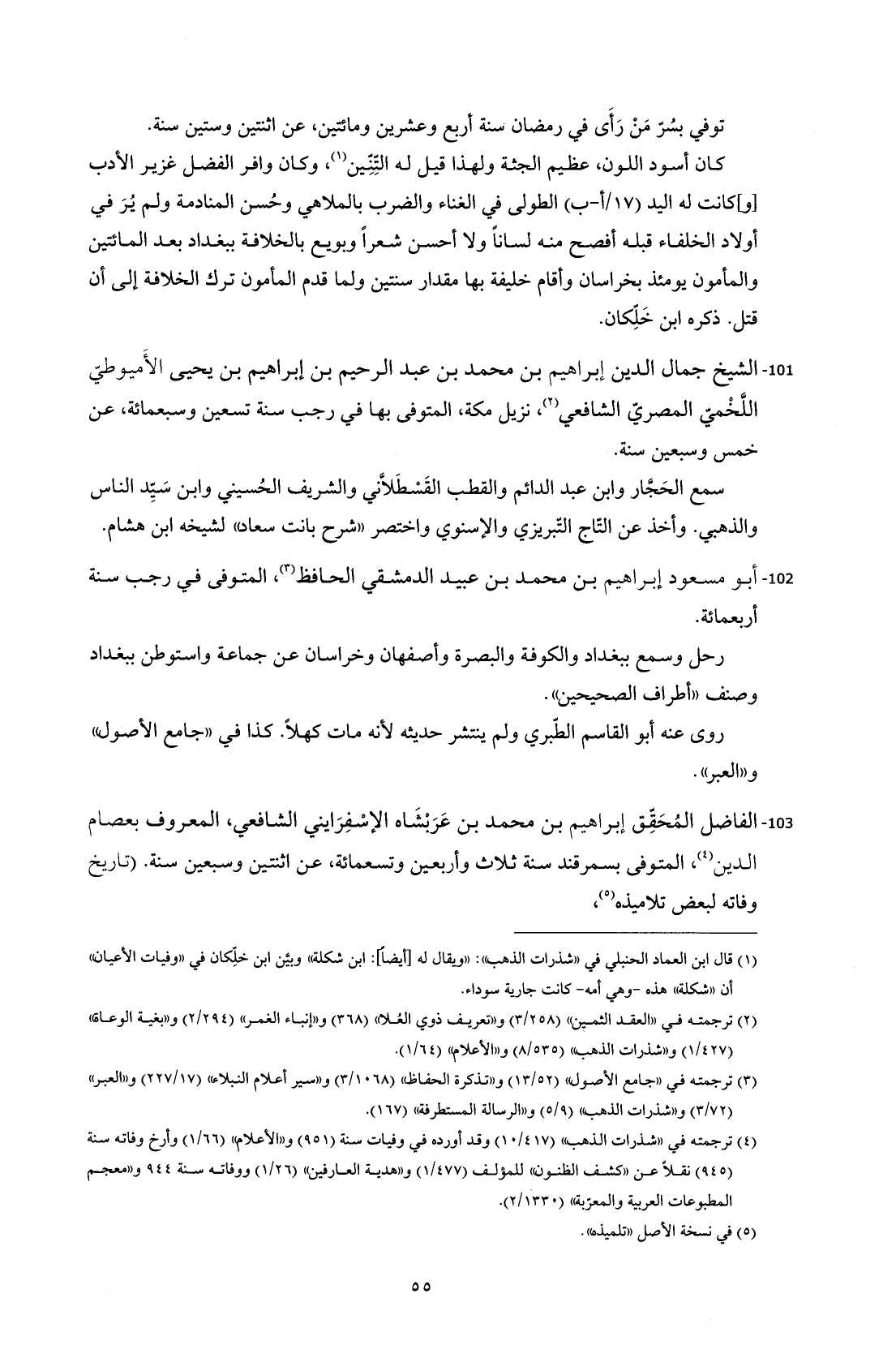 103 - الفاضل المُحَقِّق إبراهيم بن محمد بن عَرَبْشَاه الإسْفِرَايني الشافعي، المعروف بعصام الدين (¬4)، المتوفى بسمرقند سنة ثلاث وأربعين وتسعمائة، عن اثنتين وسبعين سنة. (تاريخ وفاته لبعض تلاميذه (¬5)،