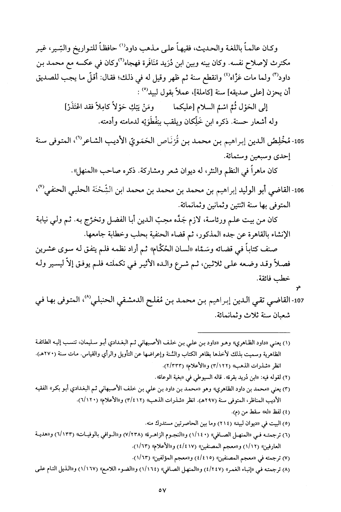 107 - القاضي تقي الدين إبراهيم بن محمد بن مُفلح الدمشقي الحنبلي (¬8)، المتوفى بها في شعبان سنة ثلاث وثمانمائة.