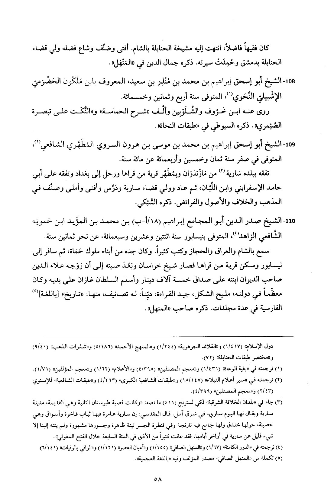 109 - الشيخ أبو إسحق إبراهيم بن محمد بن موسى بن هرون السروي المُطَهَّري الشافعي (¬2)، المتوفى في صفر سنة ثمان وخمسين وأربعمائة عن مائة سنة.