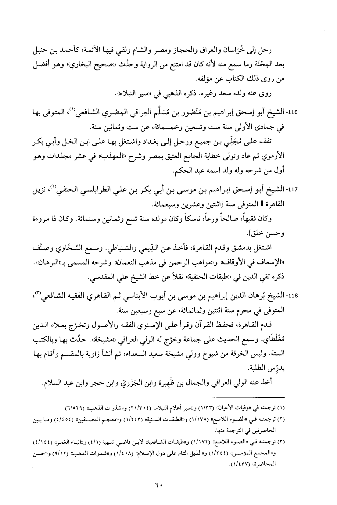 116 - الشيخ أبو إسحق إبراهيم بن مَنْصُور بن مُسَلَّم العِراقي المِصْري الشافعي (¬1)، المتوفى بها في جمادى الأولى سنة ست وتسعين وخمسمائة، عن ست وثمانين سنة.