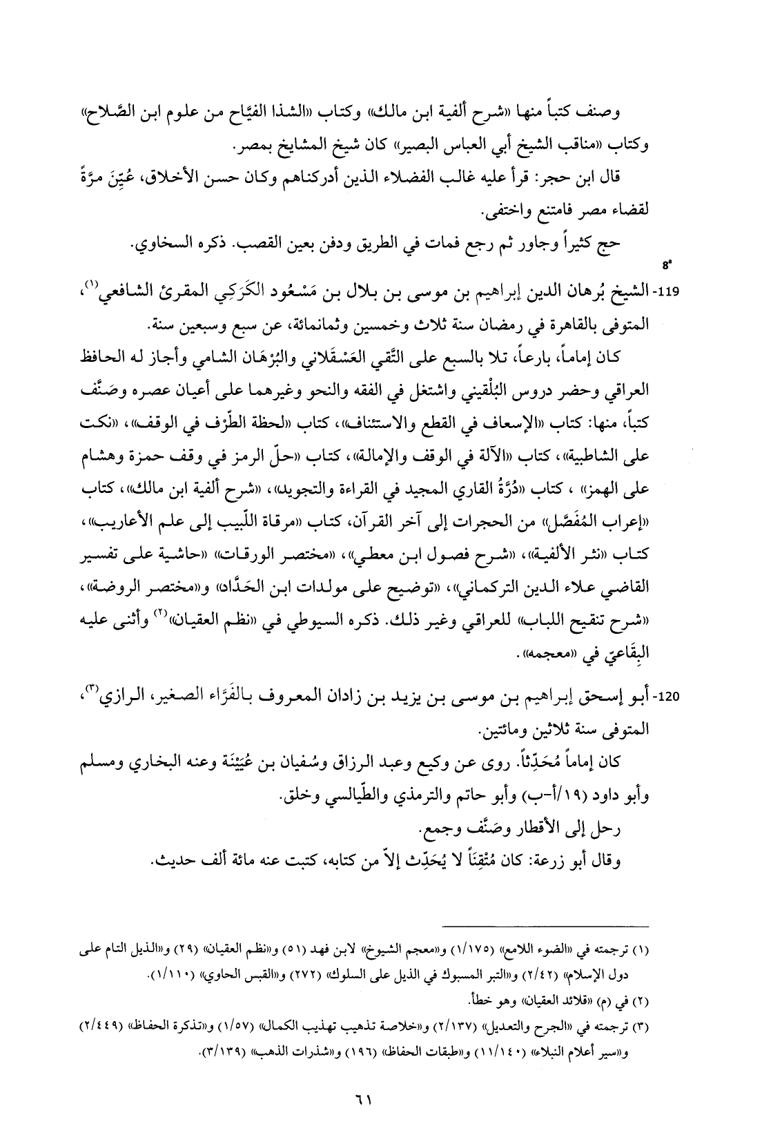 119 - الشيخ بُرهان الدين إبراهيم بن موسى بن بلال بن مَسْعُود الكَرَكِي المقرئ الشافعي (¬1)، المتوفى بالقاهرة في رمضان سنة ثلاث وخمسين وثمانمائة، عن سبع وسبعين سنة.