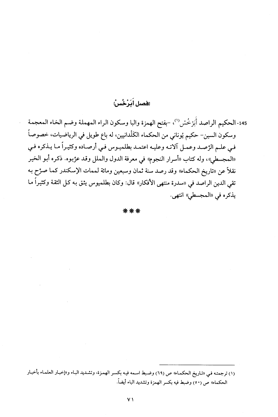 145 - الحكيم الراصد أَبَرْخُسْ (¬1)، - بفتح الهمزة والبا وسكون الراء المهملة وضم الخاء المعجمة وسكون السين- حكيم يُوناني من الحكماء الكَلْدانيين، له باع طويل في الرياضيات، خصوصاً في علم الرَّصد وعمل آلاته وعليه اعتمد بطلميوس في أرصاده وكثيراً ما يذكره في "المجسطي"، وله كتاب "أسرار النجوم" في معرفة الدول والملل وقد عرَّبوه. ذكره أبو الخير نقلاً عن "تاريخ الحكماء" وقد رصد سنة ثمان وسبعين ومائة لممات الإسكندر كما صرَّح به تقي الدين الراصد في "سدرة منتهى الأفكار" قال: وكان بطلميوس يثق به كل الثقة وكثيراً ما يذكره في "المجسطي" انتهى.