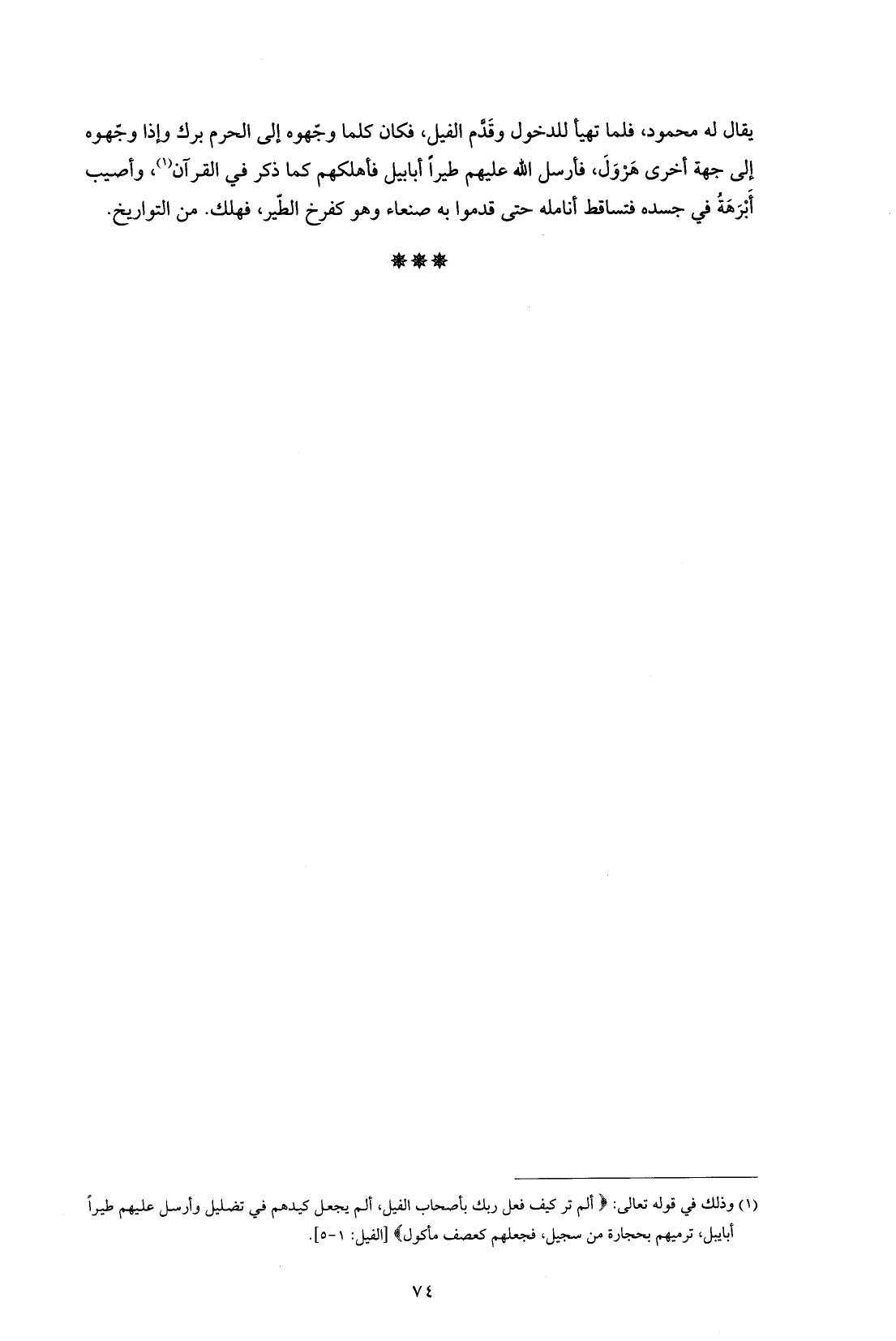 يقال له محمود، فلما تهيأ للدخول وقَدَّم الفيل، فكان كلما وجّهوه إلى الحرم برك وإذا وجّهوه إلى جهة أخرى هَزوَلَ، فأرسل الله عليهم طيراً أبابيل فأهلكهم كما ذكر في القرآن (¬1)، وأصيب أَبْرَهَةُ في جسده فتساقط أنامله حتى قدموا به صنعاء وهو كفرخ الطّير، فهلك. من التواريخ.