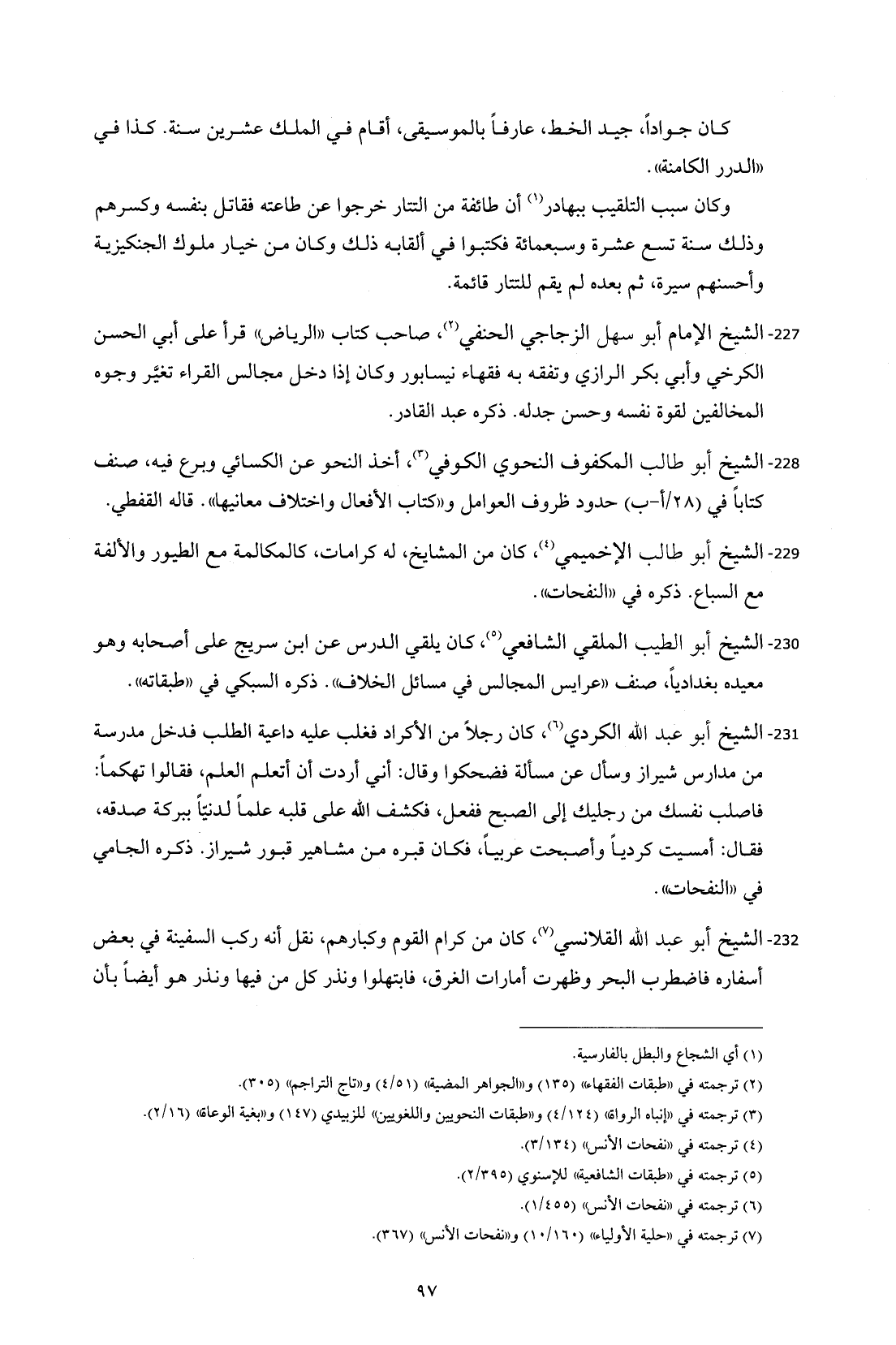 231 - الشيخ أبو عبد الله الكردي (¬6)، كان رجلاً من الأكراد فغلب عليه داعية الطلب فدخل مدرسة من مدارس شيراز وسأل عن مسألة فضحكوا وقال: أني أردت أن أتعلم العلم، فقالوا تهكماً: فاصلب نفسك من رجليك إلى الصبح ففعل، فكشف الله على قلبه علماً لدنيّاً ببركة صدقه، فقال: أمسيت كردياً وأصبحت عربياً، فكان قبره من مشاهير قبور شيراز. ذكره الجامي في "النفحات".