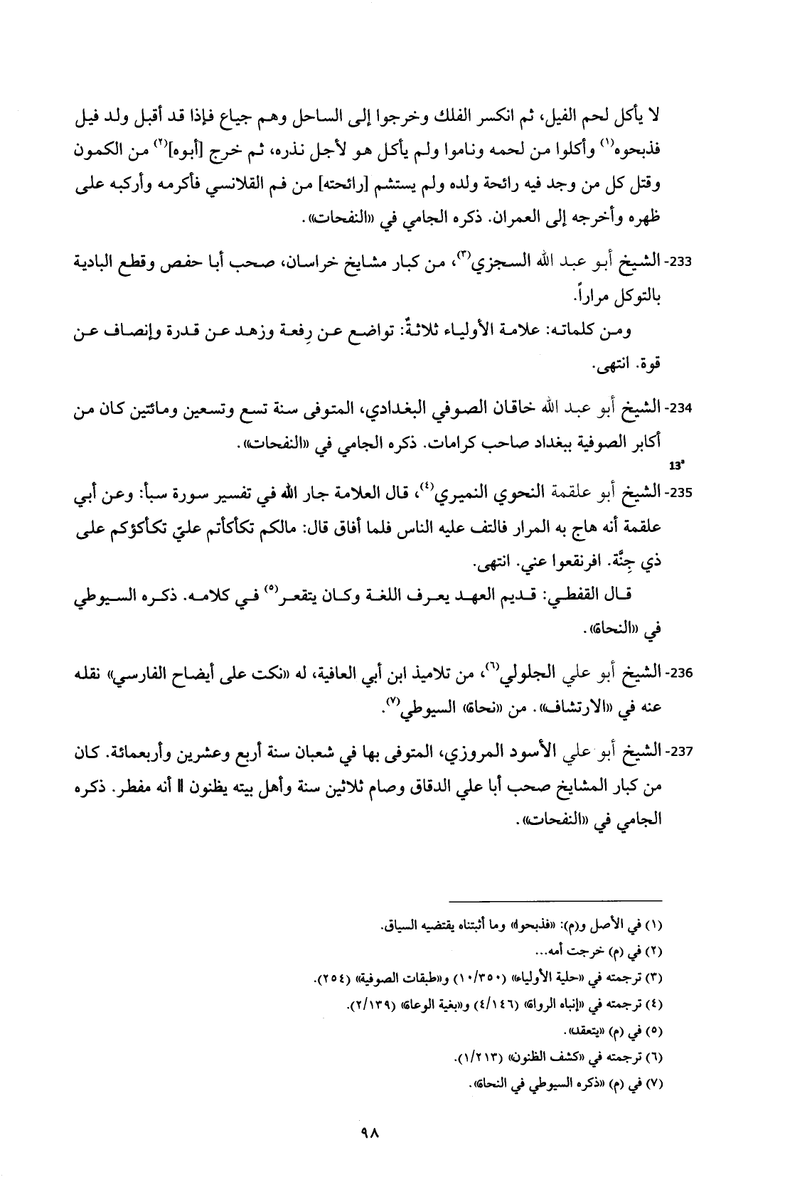 237 - الشيخ أبو علي الأسود المروزي، المتوفى بها في شعبان سنة أربع وعشرين وأربعمائة. كان من كبار المشايخ صحب أبا علي الدقاق وصام ثلاثين سنة وأهل بيته يظنون أنه مفطر. ذكره الجامي في "النفحات".