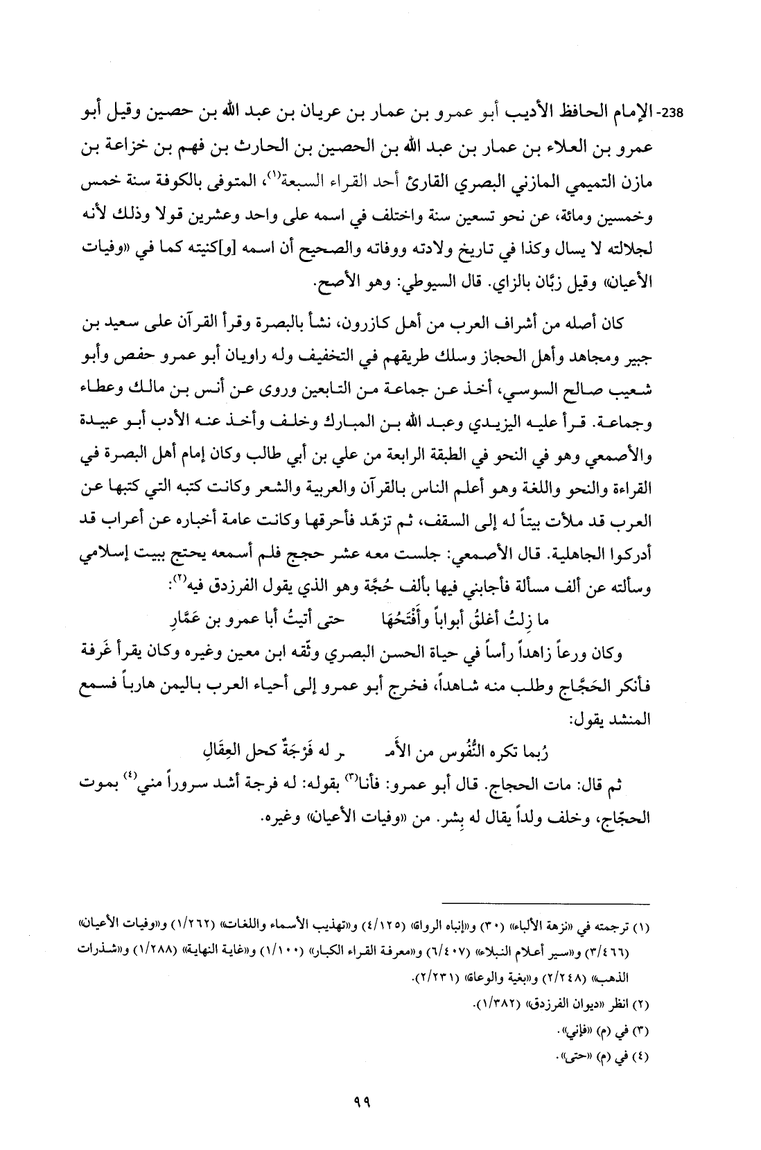 238 - الإمام الحافظ الأديب أبو عمرو بن عمار بن عريان بن عبد الله بن حصين وقيل أبو عمرو بن العلاء بن عمار بن عبد الله بن الحصين بن الحارث بن فهم بن خزاعة بن مازن التميمي المازني البصري القارئ أحد القراء السبعة (¬1)، المتوفى بالكوفة سنة خمس وخمسين ومائة، عن نحو تسعين سنة واختلف في اسمه على واحد وعشرين قولا وذلك لأنه لجلالته لا يسال وكذا في تاريخ ولادته ووفاته والصحيح أن اسمه [و] كنيته كما في "وفيات الأعيان" وقيل زبَّان بالزاي. قال السيوطي: وهو الأصح.