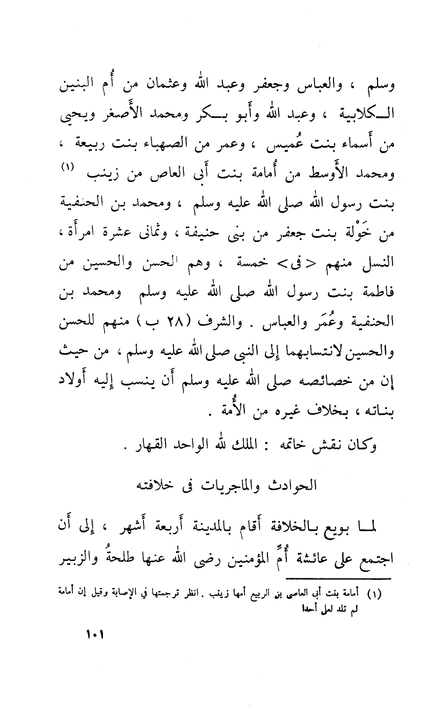 وَسلم وَالْعَبَّاس وجعفر وَعبد الله وَعُثْمَان من أم الْبَنِينَ الْكلابِيَّة وَعبد الله وَأَبُو بكر وَمُحَمّد الْأَصْغَر وَيحيى من أَسمَاء بنت عُمَيْس وَعمر من الصَّهْبَاء بنت ربيعَة وَمُحَمّد الْأَوْسَط من أُمَامَة بنت أبي الْعَاصِ من زَيْنَب بنت رَسُول الله صلى الله عَلَيْهِ وَسلم وَمُحَمّد بن الحنيفة من خَوْلَة بنت جَعْفَر من بنى حنيفَة وثمانى عشرَة امْرَأَة النَّسْل مِنْهُم فِي خَمْسَة وهم الْحسن وَالْحُسَيْن من فَاطِمَة بنت رَسُول الله صلى الله عَلَيْهِ وَسلم وَمُحَمّد بن الحنيفة وَعمر وَالْعَبَّاس والشرف (28 أ) مِنْهُم لِلْحسنِ وَالْحُسَيْن لانتسابهما إِلَى النَّبِي صلى الله عَلَيْهِ وَسلم من حَيْثُ إِن من خَصَائِصه صلى الله عليع وَسلم أَن ينْسب إِلَيْهِ أَوْلَاد بَنَاته بِخِلَاف غَيره من الْأمة