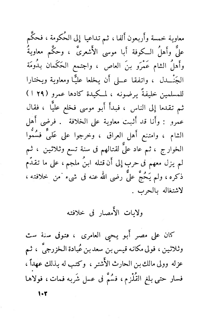 مُعَاوِيَة خَمْسَة وَأَرْبَعُونَ ألفا ثمَّ تداعيا إِلَى الْحُكُومَة فَحكم عَليّ وَأهل الْكُوفَة أَبَا مُوسَى الأشعرى وَحكم مُعَاوِيَة وَأهل الشَّام عَمْرو بن الْعَاصِ وَاجْتمعَ الحكمان بدومة الجندل واتفقا على أَن يخلعا عليا وَمُعَاوِيَة ويختارا للْمُسلمين خَليفَة يرضونه لمكيدة كادها عَمْرو (29 أ) ثمَّ تقدما إِلَى النَّاس فَبَدَأَ أَبُو مُوسَى فَخلع عليا فَقَالَ عَمْرو وَأَنا قد أثبت مُعَاوِيَة على الْخلَافَة فرضى أهل الشَّام وَامْتنع أهل الْعرَاق وَخَرجُوا على عَليّ فسموا الْخَوَارِج ثمَّ عَاد عَليّ لقتالهم فِي سنة تسع وَثَلَاثِينَ ثمَّ لم يزل مَعَهم فِي حَرْب إِلَى أَن قَتله ابْن ملجم على مَا تقدم ذكره وَلم يحجّ عَليّ رضى الله عَنهُ فس شَيْء من خِلَافَته لاشتغاله بِالْحَرْبِ