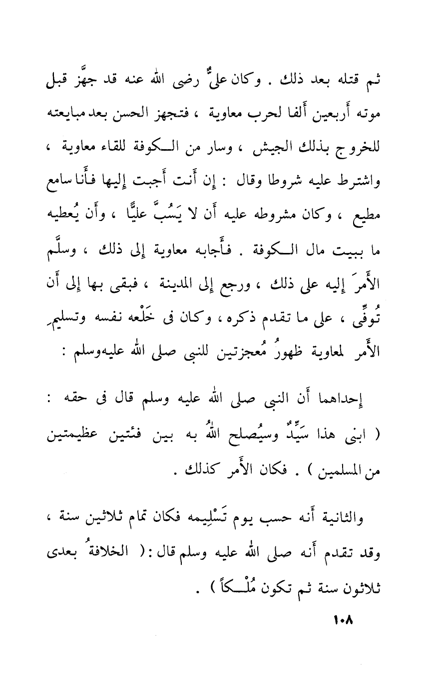 ثمَّ قَتله بعد ذَلِك وَكَانَ عَليّ رَضِي الله عَنهُ قد جهز قبل مَوته أَرْبَعِينَ ألفا لِحَرْب مُعَاوِيَة فتجهز الْحسن بعد مبايعته لِلْخُرُوجِ بذلك الْجَيْش وَسَار من الْكُوفَة للقاء مُعَاوِيَة وَاشْترط عَلَيْهِ شُرُوطًا وَقَالَ إِن أَنْت أجبْت إِلَيْهَا فَأَنا سامع مُطِيع وَكَانَ مَشْرُوطَة عَلَيْهِ أَن لَا يسب عليا وَأَن يُعْطِيهِ مَا بِبَيْت مَال الْكُوفَة فَأَجَابَهُ مُعَاوِيَة إِلَى ذَلِك وَسلم الْأَمر إِلَيْهِ على ذَلِك وَرجع إِلَى الْمَدِينَة فبقى بهَا إِلَى أَن توفّي على مَا تقدم ذكره وَكَانَ فِي خلعه نَفسه وَتَسْلِيم الْأَمر لمعاوية ظُهُور معجزتين للنَّبِي صلى الله عَلَيْهِ وَسلم