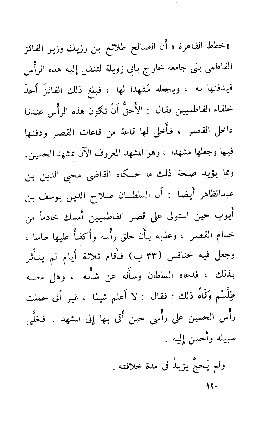 خطط الْقَاهِرَة أَن الصَّالح طلائع بن رزيك وَزِير الفائز الفاطمي بنى جَامعه خَارج بابى زويلة لتنقل إِلَيْهِ هَذِه الرَّأْس فيدفنها بِهِ ويجعله مشهدا لَهَا فَبلغ ذَلِك الفائز أحد خلفاء الفاطميين فَقَالَ الأحق أَن تكون هَذِه الرَّأْس عندنَا دَاخل الْقصر فأخلى لَهَا قاعة من قاعات الْقصر ودفنها فِيهَا وَجعلهَا مشهدا وَهُوَ المشهد الْمَعْرُوف لآن بمشهد الْحُسَيْن وَمِمَّا يُؤَيّد صِحَة ذَلِك مَا حَكَاهُ القاضى مُحي الدّين بن عبد الظَّاهِر أَيْضا أَن السُّلْطَان صَلَاح الدّين يُوسُف بن أَيُّوب حِين استولى على قصر الفاطيين أمسك خَادِمًا من خدام الْقصر وعذبه بِأَن حلق رَأسه وأكفأ عَلَيْهَا طاسا وَجعل فِيهِ خنافس (33 ب) فَأَقَامَ ثَلَاثَة أَيَّام لم يتأثر بذلك فَدَعَاهُ السُّلْطَان وَسَأَلَهُ عَن شَأْنه وَهل مَعَه طلسم وَقَاه ذَلِك فَقَالَ لَا أعلم شَيْئا غير أَنى حملت رَأس الْحُسَيْن على رأسى حِين أَتَى إِلَى المشهد فخلى سَبيله وَأحسن إِلَيْهِ