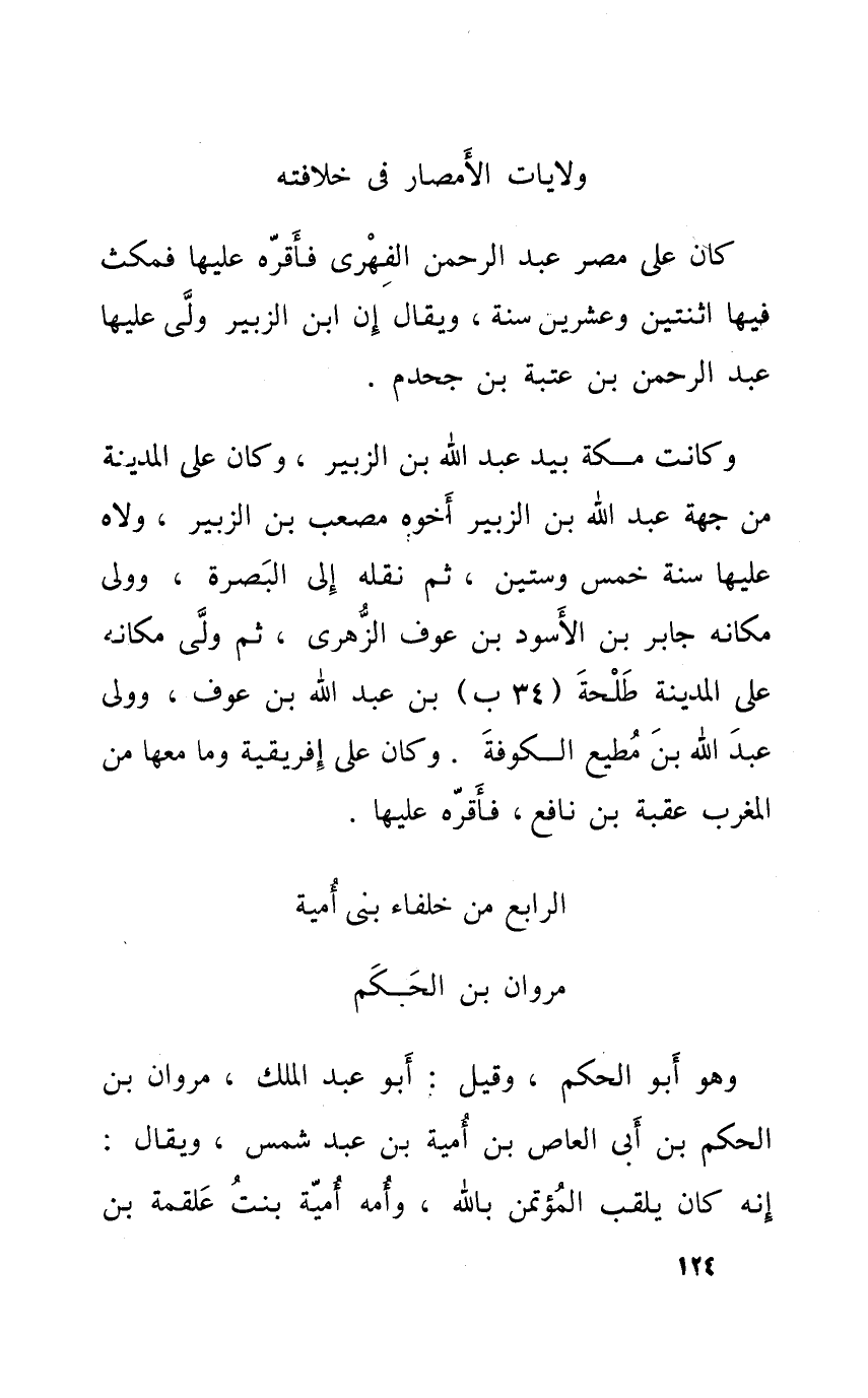 وَكَانَت مَكَّة بيد عبد الله بن الزبير وَكَانَ على الْمَدِينَة من جِهَة عبد الله بن الزبير اخوه مُصعب بن الزبير ولاه عَلَيْهَا سنة خمس وَسِتِّينَ ثمَّ نَقله الى الْبَصْرَة وَولى مَكَانَهُ جَابر بن الاسود بن عَوْف الزُّهْرِيّ ثمَّ ولى مَكَانَهُ على الْمَدِينَة طَلْحَة 34 ب بن عبد الله بن عَوْف وَولى عبد الله بن مُطِيع الْكُوفَة وَكَانَ على افريقية وَمَا مَعهَا من الْمغرب عقبَة بن نَافِع فأقره عَلَيْهَا