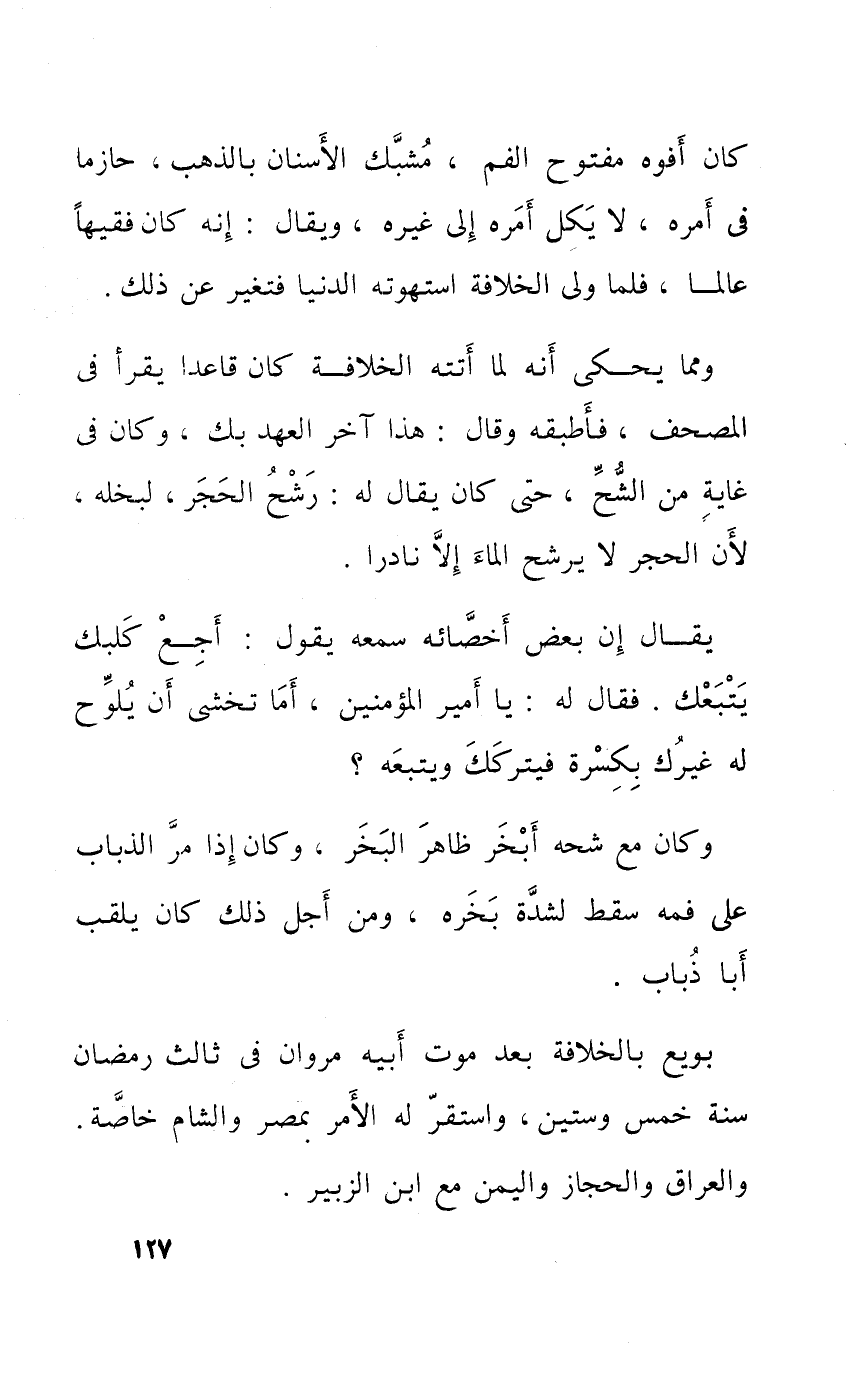 وَكَانَ مَعَ شحه ابخر ظَاهر البخر وَكَانَ اذا مر الذُّبَاب على فَمه سقط لشدَّة بخره وَمن اجل ذَلِك كَانَ يلقب ابا ذُبَاب