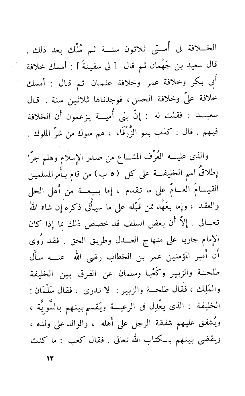 وَالَّذِي عَلَيْهِ الْعرف الْمشَاع من صدر الْإِسْلَام وهلم جرا إِطْلَاق اسْم الْخَلِيفَة على كل (5 ب) من قَامَ بِأَمْر الْمُسلمين الْقيام الْعَام على مَا تقدم إِمَّا بِبيعِهِ من أهل الْحل وَالْعقد وَإِمَّا بِعَهْد مِمَّن قبله على مَا سَيَأْتِي ذكره إِن شَاءَ الله تَعَالَى إِلَّا أَن بعض السّلف قد خصص ذَلِك بِمَا إِذا كَانَ الإِمَام جَارِيا على منهاج الْعدْل وَطَرِيق الْحق فقد روى أَن أَمِير الْمُؤمنِينَ عمر بن الْخطاب رَضِي الله عَنهُ سَأَلَ طَلْحَة وَالزُّبَيْر وكعبا وسلمان عَن الْفرق بَين الْخَلِيفَة وَالْملك فَقَالَ طَلْحَة وَالزُّبَيْر لَا ندرى فَقَالَ سلمَان الْخَلِيفَة الَّذِي يعدل فِي الرّعية وَيقسم بَينهم بِالسَّوِيَّةِ ويشفق عَلَيْهِم شَفَقَة الرجل على أَهله وَالْوَالِد على وَلَده وَيقْضى بَينهم بِكِتَاب الله تَعَالَى فَقَالَ كَعْب مَا كنت