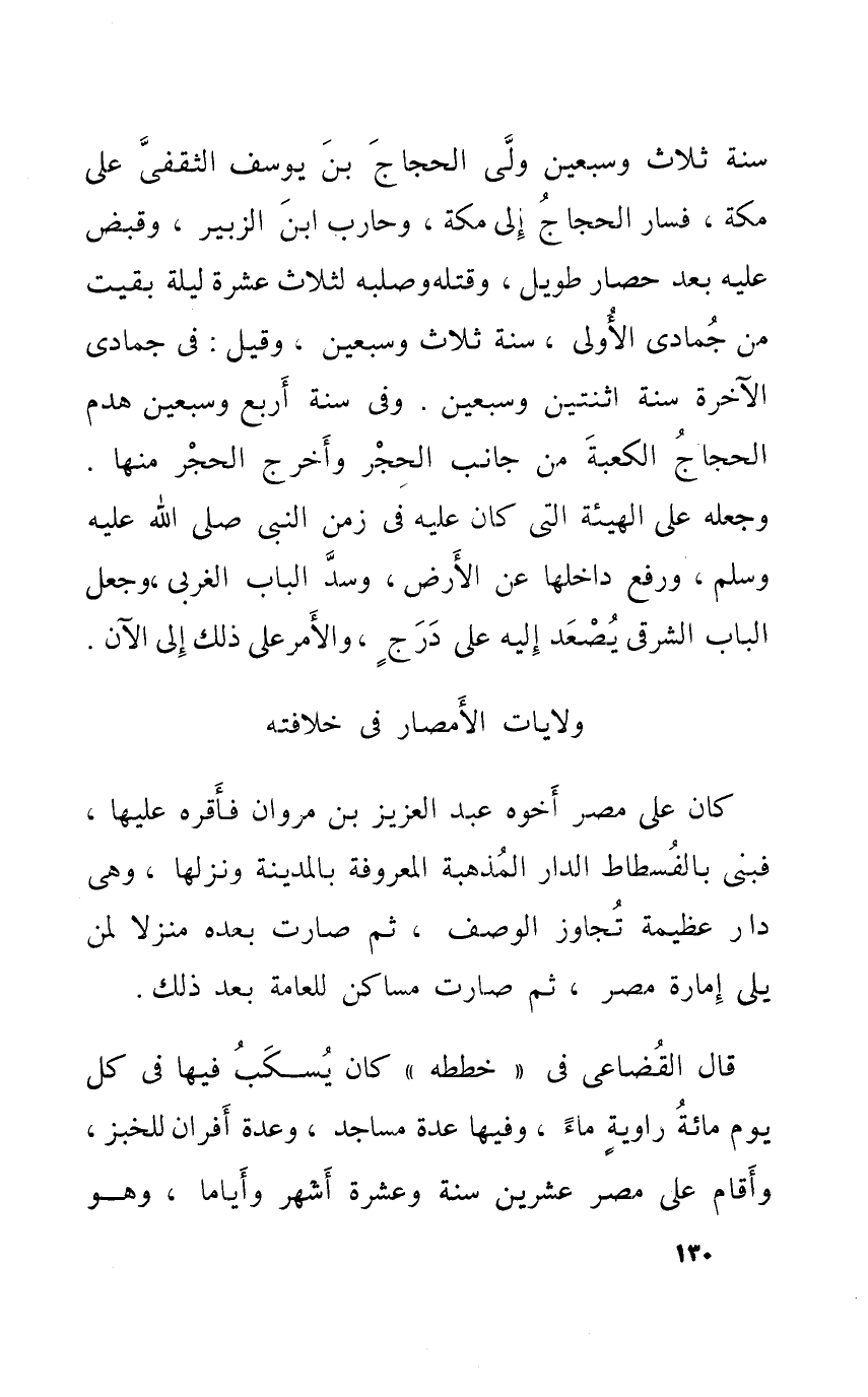 سنة ثَلَاث وَسبعين ولى الْحجَّاج بن يُوسُف الثَّقَفِيّ على مَكَّة فَسَار الْحجَّاج الى مَكَّة وَحَارب ابْن الزبير وَقبض عَلَيْهِ بعد حِصَار طَوِيل وَقَتله وصلبه لثلاث عشر لَيْلَة بقيبت من جمادي الاولى سنة ثَلَاث وَسبعين وَقيل فِي جمادي الاخرة سنة اثنيتين وَسبعين وَفِي سنة ارْبَعْ وَسبعين هدم الْحجَّاج الْكَعْبَة من جانتب الْحجر واخرج الْحجر مِنْهَا وَجعله على الْهَيْئَة الَّتِي كَانَ عَلَيْهِ فِي زمن النَّبِي صلى الله عَلَيْهِ وَسلم وَرفع داخلها عَن الارض وسد الْبَاب الغربي وَجعل الْبَاب الشَّرْقِي يصعد اليه على درج والامر على ذَلِك الى الان