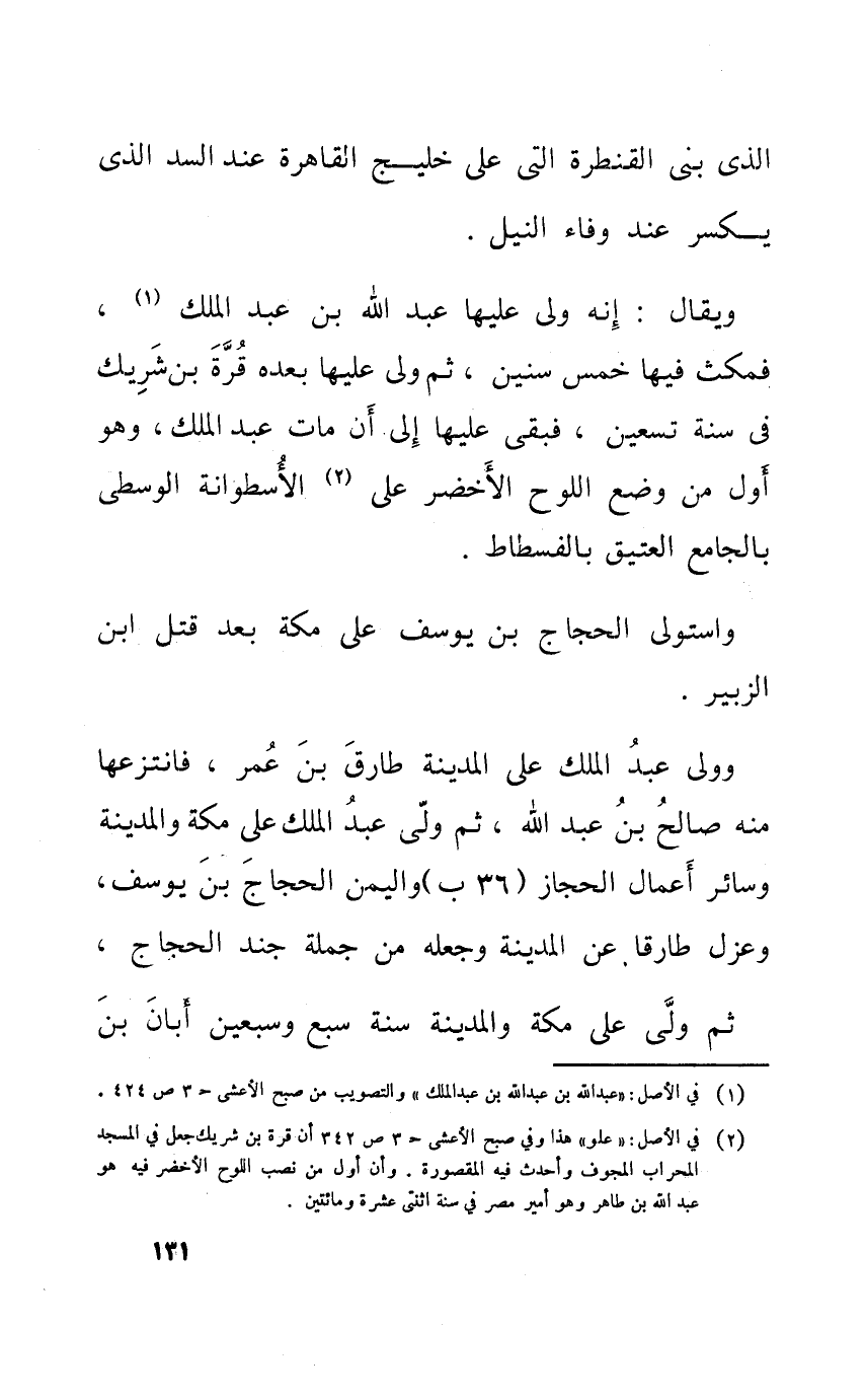 وَيُقَال انه ولى عَلَيْهَا عبد الله بن عبد الْملك فَمَكثَ فِيهَا خمس سِنِين ثمَّ ولى عَلَيْهَا بعده قُرَّة بن شريك فِي سنة تسعين فبقى عَلَيْهَا الى ان مَاتَ عبد الْملك وَهُوَ اول من وضع اللَّوْح الاخضر على الاسطوانة الْوُسْطَى بالجامع الْعَتِيق بالفسطاط